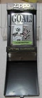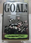This is an unused 1996 full size Zippo in a black plastic case. It has graphics on it of a cartoon character playing soccer. Buyer agrees to pays shipping cost. I do combine shipping and I only ship to United States addresses.