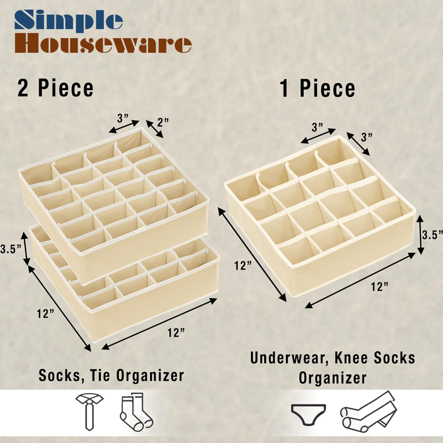 Fast Shipping On All Items 30 Days Money Guarantee Customer Support Excellent Service 100% Satisfaction Satisfaction Guaranteed Sock Drawer Organizer for Dresser/Closet/Bedroom, 3 Pack, Beige Specification Number of Compartments 40 Color Beige Finish Type Beige Product Dimensions 12"D x 12"W x 3.5"H Material Polyester Blend Specific Uses For Product Sock Organizer Item Weight 0.3 Kilograms Shape Rectangular Special Feature Foldable, multiple compartments / cells Size 3 Pack 12.0 "h x 12.0 "h x 3.5 "h. Weight: 0.3 kg Item Description 2 Pack 24 cells and 1 pack 16 cells drawer organizer. Good for organizing your socks, underwear, ties and etc.. Made with non-woven fabric. Easy to access your small items and keep your drawer nice and neat. The containers are collapsible that save your space. Lightweight solution for easy carrying. Dimension: 12" W x 12" L x 3.5" H. Product description Good for organizing your lingerie, socks, underwear when you finish laundry and easy to access them while you need it. Made with non-woven fabric. Drawer Walking Closet Standard Closet Shelves Rack Great Organizer for Drawer and Closet Simple Houseware Closet Organizer Series Add to Cart Add to Cart Add to Cart Add to Cart Add to Cart Add to Cart Customer Reviews 4.5 out of 5 stars 61,998 4.6 out of 5 stars 20,450 4.6 out of 5 stars 20,450 4.6 out of 5 stars 11,862 4.6 out of 5 stars 11,862 4.6 out of 5 stars 20,450 Price $15.87 $ 15 . 87 $15.97 $ 15 . 97 $9.99 $ 9 . 99 $9.99 $ 9 . 99 $14.97 $ 14 . 97 $24.97 $ 24 . 97 Divider ✔ ✘ ✘ ✔ ✔ ✘ Bins 4 6 4 2 3 12 Size 4 3 2 1 2 3 For Socks ✔ ✘ ✘ ✔ ✔ ✘ For Clothes ✘ ✔ ✔ ✘ ✘ ✔ About us We offer the best prices around on high quality products. Our E-store includes media such as books, movies, music and games while offering electronics, toys, sporting apparel, clothing, tools, general home, garden items and more. Shipping We are always working hard to ensure your package arrives as soon as possible. Please understand that some factors like weather, high postal traffic, and the performance of shipping companies are outside of our control. We offer free shipping to the lower 48 states and ship within 2-3 business days of payment, usually sooner. We do not accept P.O. Boxes. Please provide a physical address. For shipping outside of the continental USA, we only use eBay's Global Shipping Program.The item is shipped to KY and then sent to the rest of the world. International customers are responsible for all duties and taxes. Continue to check out to calculate costs for shipping the item to your country. Messages regarding eBay's Global Shipping Program MUST be directed at eBay EXCLUSIVELY. Returns We offer a 30-Day Return Policy on items in which you are not completely satisfied with. You have the option of a full-refund or an exchange of the item. No returns are available on items shipped outside of the USA Satisfaction We try over very best to make sure every customer is completely satisfied. If there's a problem, message us! We're happy to help. Payment Options Shop With Confidence