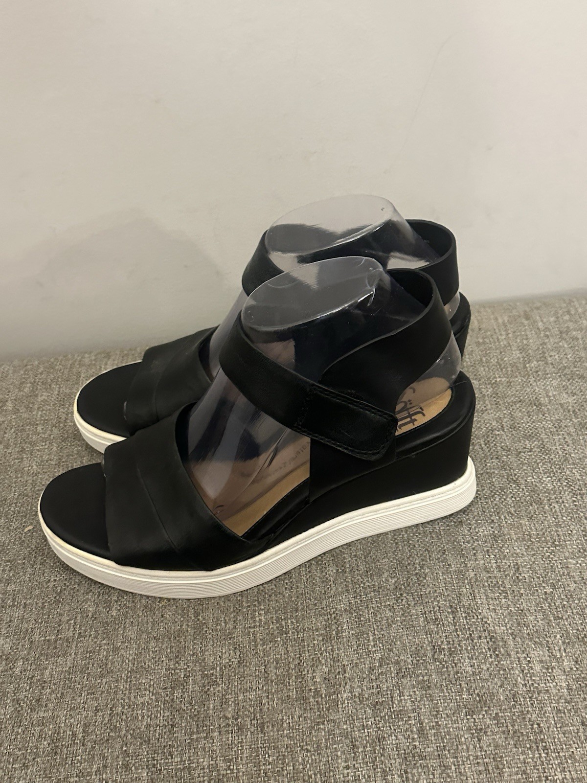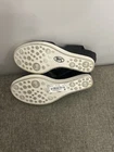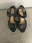 The Sofft Women’s Black Leather Slingback Wedge Sandal in size 9 features a solid black color with a low wedge heel. The sandal has a hook and loop closure, a slingback style with an open toe design, and is made of leather with cushioned comfort. It also includes accents with the brand logo, making it a stylish and comfortable option for women's footwear. Preowned Good Condition