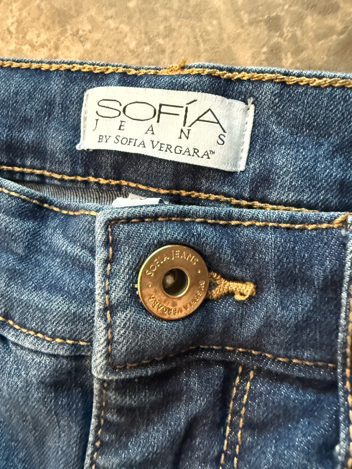 The Sofia Vergara Jeans Women's 6 Blue Melisa Flare Stretch Faded Dark Wash Denim are stylish and comfortable denim pants designed for women. Featuring a flared style with a mid-rise fit, these jeans have a zip and button closure, an elastic waist for added comfort, and a 5-pocket design. Made from a blend of polyester, spandex, and cotton, these jeans are perfect for all seasons and can be machine washed for easy care. The dark wash and solid blue color add a trendy touch, while the Sofia Vergara logo accents give a touch of personal style to your wardrobe. 59% Cotton 28% Recycled Polyester 12% Viscose 1% Spandex