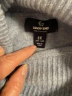 Beautiful blue (cornflower blue?) turtleneck pullover sweater with ribbed cuffs and hem. Approximate measurements are in the photos. Please review for an accurate fit.