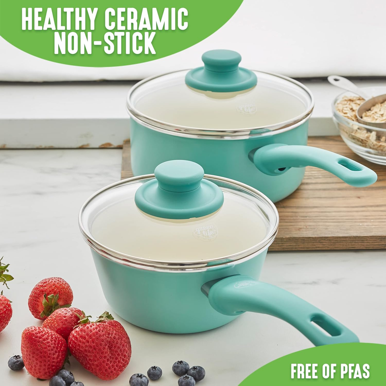 Store New Arrivals Add to Favorite View Feedback Contact Soft Grip Healthy Ceramic Nonstick, 1QT and 2QT Saucepan Pot Set With Description Item model number CC002559-001 Style Saucepans Country of Origin China Is Oven Safe Yes With Lid Yes Number of Pieces 4 Item Volume 1.89 Liters Material PFAS Free Ceramic Nonstick, Bakelite Handles Compatibility Options stove Closure Material Glass Is Dishwasher Safe Yes Item Weight 4.69 pounds Material Type Free Cadmium Free, Perfluorooctane Sulfonate (PFOS) Free, Perfluorooctanoic Acid (PFOA) Free, Bisphenol-A (BPA) Free, PFAS Free, Lead Free Special Feature Gas Stovetop Compatible, Electric Stovetop Compatible Utensil Compatibility Metal, Wood, Silicone, Plastic Color Turquoise Global Trade Identification Number 00885837019506 Handle Material Bakelite Included Components Saucepans with Lids, 1-Quart and 2-Quart Product Dimensions 16.73 x 10.24 x 6.1 inches Size 1 Quarts HEALTHY CERAMIC NONSTICK: Our healthy and easy-to-clean ceramic nonstick coating is derived from sand and delivers effortless release with quick cleanup TOXIN-FREE: Our coating is free of PFAS, PFOA, lead, and cadmium so you can make every meal healthier EXPERT-DESIGNED COOKWARE: Crafted by culinary experts to meet the demands of both home cooks and professional chefs, ensuring superior performance in every kitchen WOBBLE-FREE BASES: Each frypan is reinforced with a wobble-free base for extra strength and even heating EASY TO CLEAN: Dishwasher safe, but most messes wipe away SNAG-FREE INTERIORS: The rivetless interiors prevent food buildup and make cleaning simple EASY VIEW GLASS LIDS: Durable glass lids offer an easy way to check on any meal in progress EFFORTLESS PERFORMANCE: Delivers on all stovetops, except induction and oven safe up to 350˚F MADE WITH RECYCLED MATERIALS: Cookware vessels (excluding handles) are made from a minimum of 65% recycled materials. The Soft Grip collection is all about comfort and control. Designed for effortless performance and cleanup, this set features our toxin-free Thermolon nonstick coating, which is free of PFAS, PFOA, lead, and cadmium. GreenLife’s healthy ceramic nonstick is not stuck in the past—that’s why our ceramic nonstick starts with sand and creates 60% less CO2 emissions during the curing phase than traditional coatings. The pans are also crafted with recycled aluminum, because we want your kids’s kids to cook healthy, too. Finished in vibrant colors, this set is outfitted with stay-cool handles to keep your cooking comfortable. Durable glass lids for a good look at any meal in progress without sacrificing heat. For all stovetops, except induction. Oven safe to 350°F. Dishwasher safe. This cookware set includes: 4-inch mini frypan, 7-inch and 9.5-inch open frypans, 1-quart and 2-quart covered sauce pans, 5-quart covered stockpot, 2.5-quart covered sauté pan, stainless steel steamer, and 4 kitchen utensils. ABOUT US We offer the best prices around on high quality products. Our E-store includes media such as books, movies, music and games while offering electronics, toys, sporting apparel, clothing, tools, general home, garden items and more. SHIPPING We are always working hard to ensure your package arrives as soon as possible. Please understand that some factors like weather, high postal traffic, and the performance of shipping companies are outside of our control. RETURNS We offer a 30-Day Return Policy on items which you are not completely satisfied with. You have the option for a full-refund or an exchange of the item. PAYMENT We accept PayPal. CONTACT US This page content is yet to come Please ad us to your favorite seller and visit again later Thank You CUSTOMER SATISFACTION We try our very best to make sure every customer is completely satisfied. If there's a problem, message us! We're happy to help.