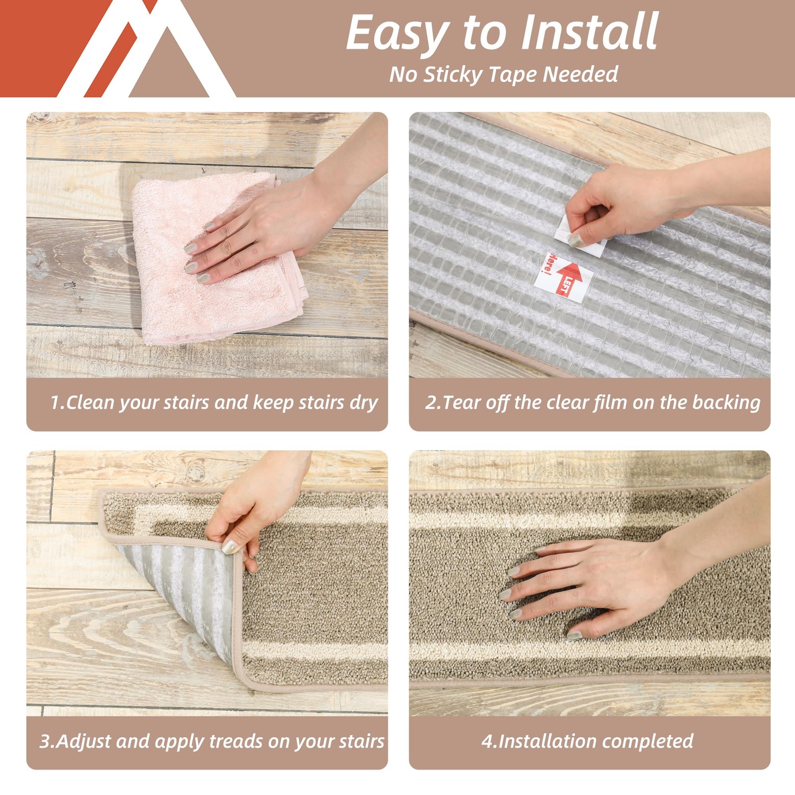 NON-SLIP COSYHOMEER SOFT STAIR RUG: Multi-purpose Stair mats to use the TPE Non-Skid backing on dry floor, helping it to stay in place on your floor, it won't slip or scuff floors. Low profile design so doors won't get stuck.Perfect for homes with pets (dogs or cats) or kids. NON-SLIP STAIR RUG: Multi-purpose Stair mats to use the TPE Non-Skid backing on dry floor, helping it to stay in place on your floor, it won't slip or scuff floors. The soft texture adds comfort and safety. Perfect for homes with pets (dogs or cats) or kids and older HOW TO USE Stair Treads for Step: Just clean, peel, and stick! If you need to reposition or remove, this stair Treads can be easily repositioned or removed without leaving any residue, ensuring your floors stay pristine. Even when exposed to water, these treads stay securely in place without slipping Stair Treads Mat Dimensions: Each mat measures 28" x 9"with a thickness of 0.4". Crafted from 100% polyester for durability and comfort Versatile for Multiple Spaces: Designed with durable anti-slip strips that maintain their grip even after 30 washes, these stair mats are ideal for restaurants, family rooms, hallways, playrooms, and children's bedrooms : Our brand is always pursuing customer satisfaction as the top of priority. We are glad to receive more suggestions from our customers, if the stair rug mat has problems, we will process any request from customer with 24 hours, and will be paid by us for any quality issues