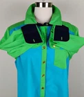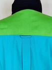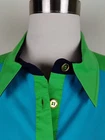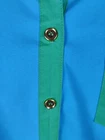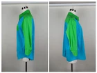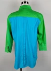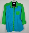 Tunic length button front shirt is bold and bright green and blue colorblocking. The 3/4 sleeves feature cuffs with single button closures. Large pleat in back. Spread collar and front chest patch pocket. Long length makes this perfect to pair with jeans, slacks, or leggings. Size and fabric tags are missing. Research on this style shows it is 67% cotton, 29% polyester, 4% spandex and machine washable. Estimated size is a medium to large but please check measurements listed below for fit. SIZE: M/L (please check measurements below) COLOR: Blue, Green MATERIAL CONTENT: 67% cotton, 29% polyester, 4% spandex STYLE: Button Down CARE: Machine wash CONDITION: Great pre-owned condition with no fading, stains, pilling, or tears. There is a small pinhole above left cuff from hang tag. Please see photos for details. FLAT MEASUREMENTS (approximate) Underarm to Underarm: 21" Shoulder to Hem: 30" Sleeve Length: 19" Waist: 20.5" Hip: 23" Size XS/S form measurements: Bust 35", Waist 24", Hips 35" If you have any questions, please don’t hesitate to ask. Thanks for viewing our listing! Lightweight, artsy, relaxed fit, roomy, office, casual
