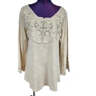 In excellent condition Soft Surroundings Cream Lace Applique Bell Sleeve Tunic Top Size Medium Women's. Features peasant style neutral cream tunic top by Soft Surroundings, scoop neck with feminine floral lace across chest, long flowy bell sleeve with lace applique, lagenlook, lace like pattern throughout top, boho chic, bohemian. Measurements laying flat chest 20" length 28.5" arm inseam 15.5" Fabric cotton This is a pre-owned item that may show signs of wear. In excellent condition, no flaws.