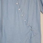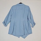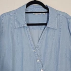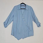 The popular, crossover-front tunic in drapey Tencel Lyocell. Vintage washed for ultra-softness and a bit of an edge, it features an asymmetrical point hem and fuss-free fit. Collared v-neck tunic top Button up Mother-of-pearl-looking buttons Roll tab sleeves Cross over style with asymmetrical hem Inside tie for added fit and comfort Light Wash Denim Super soft 100% tencel lyocell Size XL APPROXIMATE MEASUREMENTS Length: 31" Sleeves: 21" (unrolled) PTP: 22" Size XL Excellent condition! No tears or stains. Pet-free and smoke-free environment Bundle with other items from my closet for the best deal! Tags: coastal, coastal grandma, grannycore, cottagecore, lagenlook