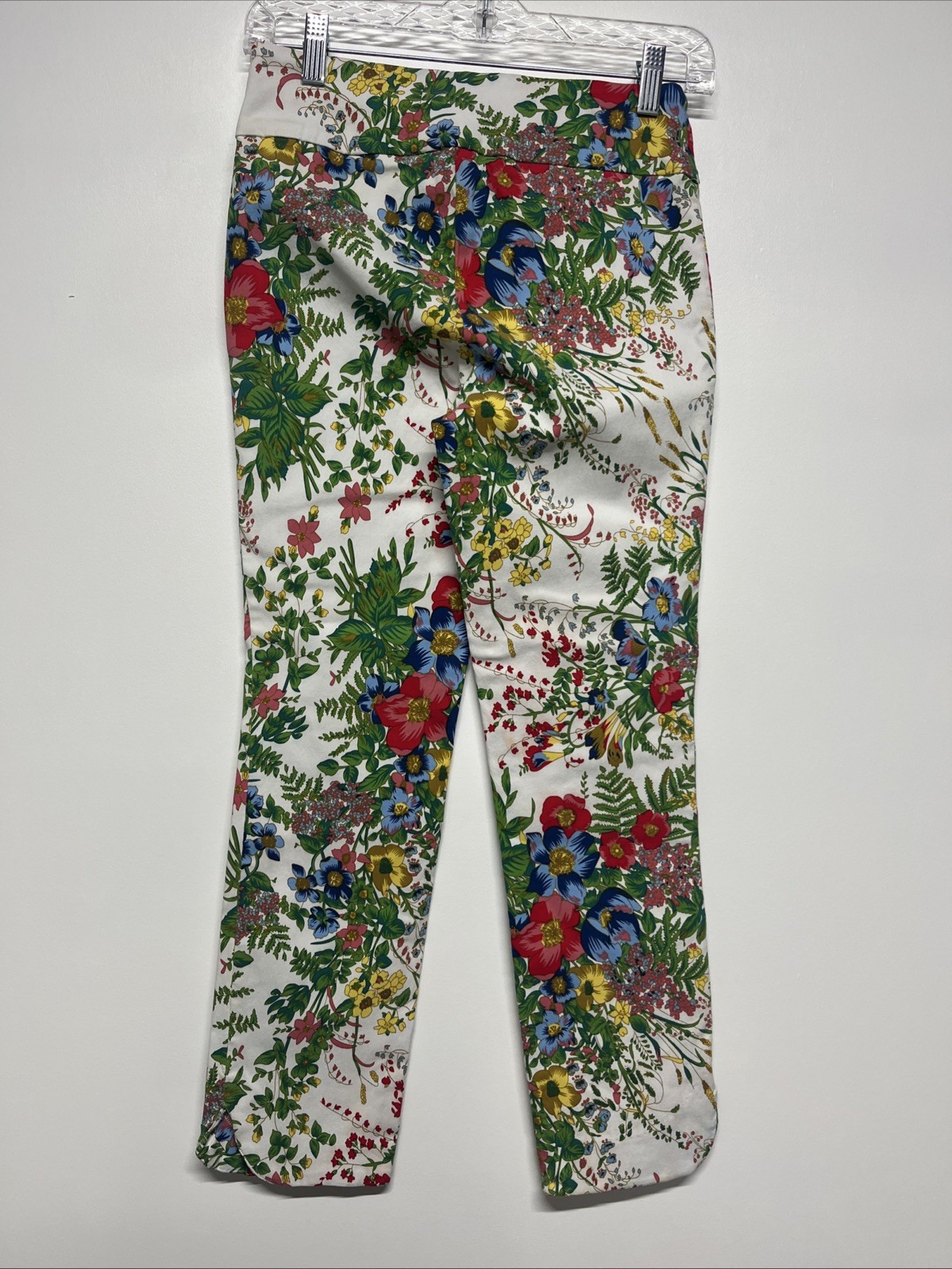 These Soft Surroundings In Bloom ankle crop pants in women's XS feature a floral fern pattern, pull-on closure, and tummy control design. Made from a blend of nylon, spandex, and rayon, these white pants have a mid-rise and straight leg style, making them perfect for casual and business occasions. The bohemian and preppy themes, along with the slimming and stretch features, make these pants a stylish and comfortable choice for the summer and spring seasons. With a waist size of 24 inches and a regular fit, these pants offer a flattering silhouette for petite women.