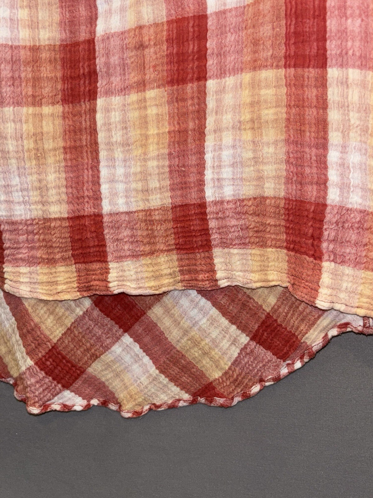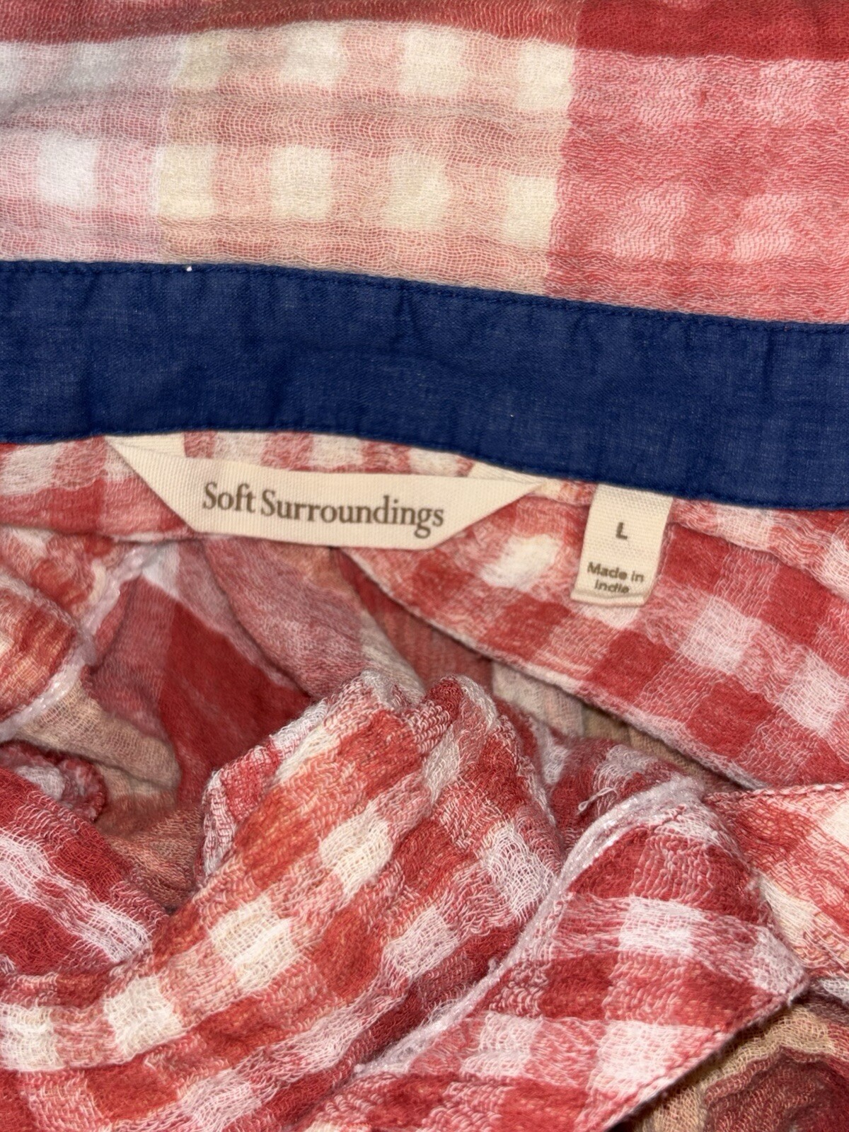 This is a stylish Soft Surroundings tunic blouse in red and yellow plaid, featuring long sleeves with a casual sleeve type. It has a collared neckline with a button closure, made of comfortable cotton material. The blouse is a size Large and offers a regular fit, perfect for a bohemian-inspired look.