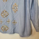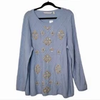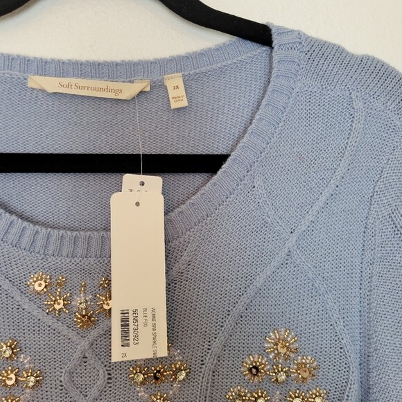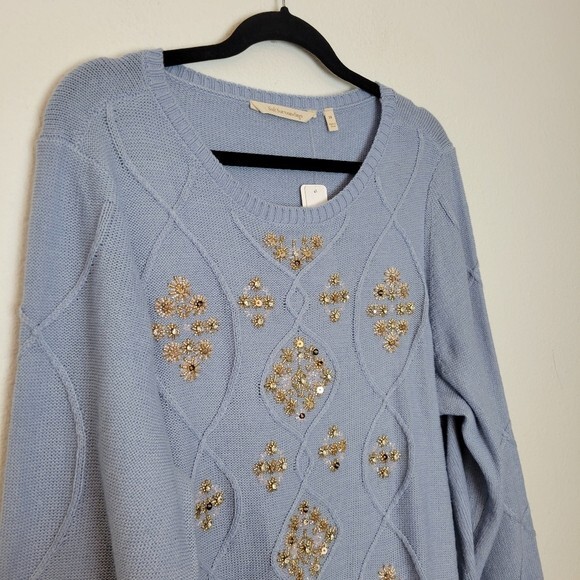Soft Surroundings Plus Sz 2X Blue Isra Sparkle Beaded Wool Blend Sweater Winter. Ships With USPS Ground Advantage Mail -Radiate light and love in this ornate cable-knit sweater with clear and gold sequin beaded winter snowflake like details. Boatneck styling in a light to midweight fabrication -Size 2X -Color for sale is blue, stock photo for fit and style reference only -Pullover styling -Classic Fit -Cable knit -70% Acrylic, 30% Wool (except 1% nylon added in rib trims) Hand wash cold separately, inside out -Measurements are approximately 25 in armpit to armpit and 31 in long -New with tags perfect condition! -------------------------------------- Thanks for looking, feel free to reach out with any questions! I offer FAST shipping when payment is received. Have a a GREAT DAY! @mandajane223
