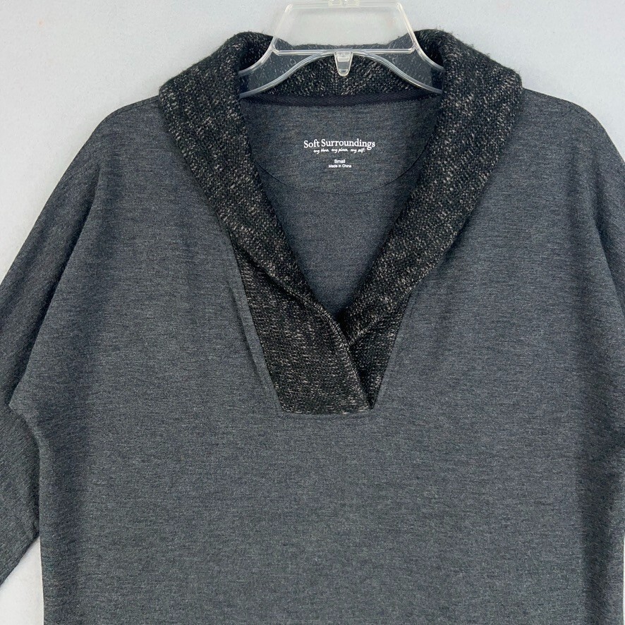 Soft Surroundings Sweater Womens Small Gray Tunic Pockets Oversized Comfy Cozy Condition: - Overall in good used condition. - No rips, stains, or tears. - Nice shawl collar and a gray stretch fabric. - Long sleeves with sweater knit cuffs and shawl collar. Size: - Womens small. Measurements: - Previous washings may change the sizing written on the tag. - Please refer to the photos above for all measurements. - Please compare our measurements to that of one of your favorite garments. - Please note, item measurements are approximate. All items are bagged and sealed after being photographed, then stored in a smoke free environment to ensure the item is exactly the same as when photographed. I carefully package and ship daily. Feel free to contact me with any questions. All items have been washed per eBay standards & policies.