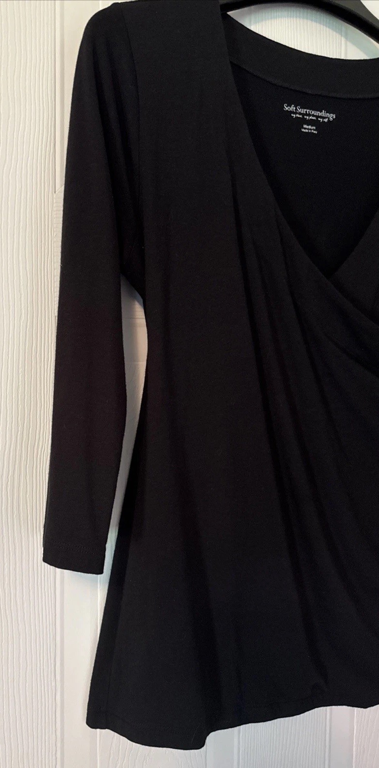 The Soft Surroundings Women's Black Faux Wrap Style V-Neckline Top in size M is a versatile and stylish blouse perfect for various occasions such as travel, parties, or casual outings. Made from a lightweight and breathable spandex-cotton blend, this top features a classic v-neckline, 3/4 sleeves, and a pullover closure for easy wear. The black solid color and basic style make it a timeless addition to any wardrobe, while the regular fit ensures comfort and a flattering silhouette. Ideal for the summer, fall, and spring seasons, this top is machine washable for easy care and maintenance. Soft. Fast shipping