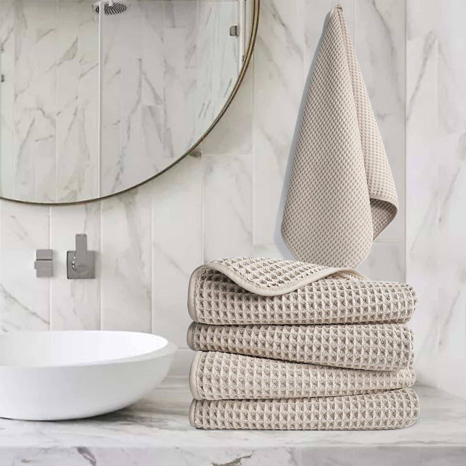 If we may, would you care for some helpful hand towels? We created them just for you, so you can experience a SUPER SOFT feeling on the skin without the heft and bulk. They are infused with SUPER ABSORBENT properties to effectively and thoroughly dry your hands and face. Towels, themselves, DRY QUICKLY to RESIST ODORS. Allow us to share how to EASILY CARE for these helpful towels. Recommend washing separately to prevent collecting lint or debris from other garments and textiles. Please hand or machine wash in warm water with like colors and air dry or dry on the low setting. Recommend using wool dryer balls to reduce any static when drying. We ask you not use fabric softener, bleach, dryer sheets or the towels may become less helpful. Please do not wash with items that have hardware that can catch and pull the threads. Key Product Features Size Large: 16 inches by 30 inches or 40.64 cm by 76.2 cm Weave: waffle Edges/Trim: polyester with rounded corners Includes: 4 towels Experience the soft feeling of premium microfiber hand towels against your skin without the heft and bulk; simply pat dry Microfiber thoroughly dries faster and gentler than traditional fibers; waffle weave feels smoother on your skin and is less likely to collect lint or debris Towels will quickly dry when hanging to help prevent the formation of odors; folds into a compact size to be used in the bathroom, on travel, at the pool, camping, gym or anywhere else Large 16 in. x 30 in. surface area for maximum drying of your hands, face, and large enough for some to dry hair with a stylish trim and loop for easy hanging Our Deluxe Weight > 429 gsm; top layer of fibers has slightly loose construct; necessary characteristic for much higher weight/gsm waffle weave microfiber; please do not wash with items that have hardware that can catch and pull the threads