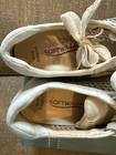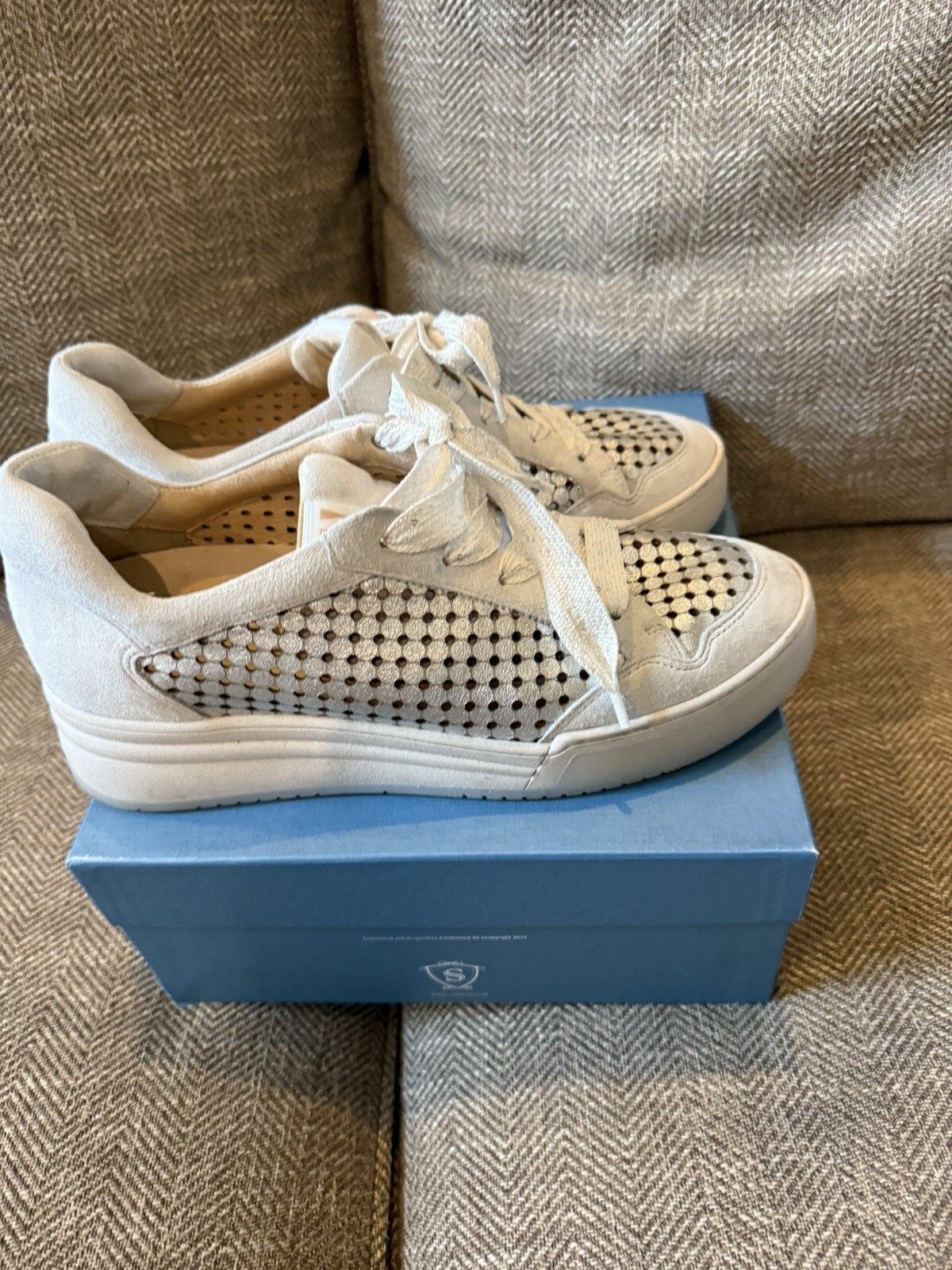 Stamped leather in metallic lamina wash silver finish and 'Ice' off-white colored suede characterize this glam style from Softwaves for spring '24. Dress up or down with jeans or a skirt for an eye-catching, cool statement sneaker with all-day wearability. Heel height: 4.5 cm / ~1.75 in Please note that these run very short and I am a 9.5 normally and these fit great. I would recommend trying them on in a store to know your size.