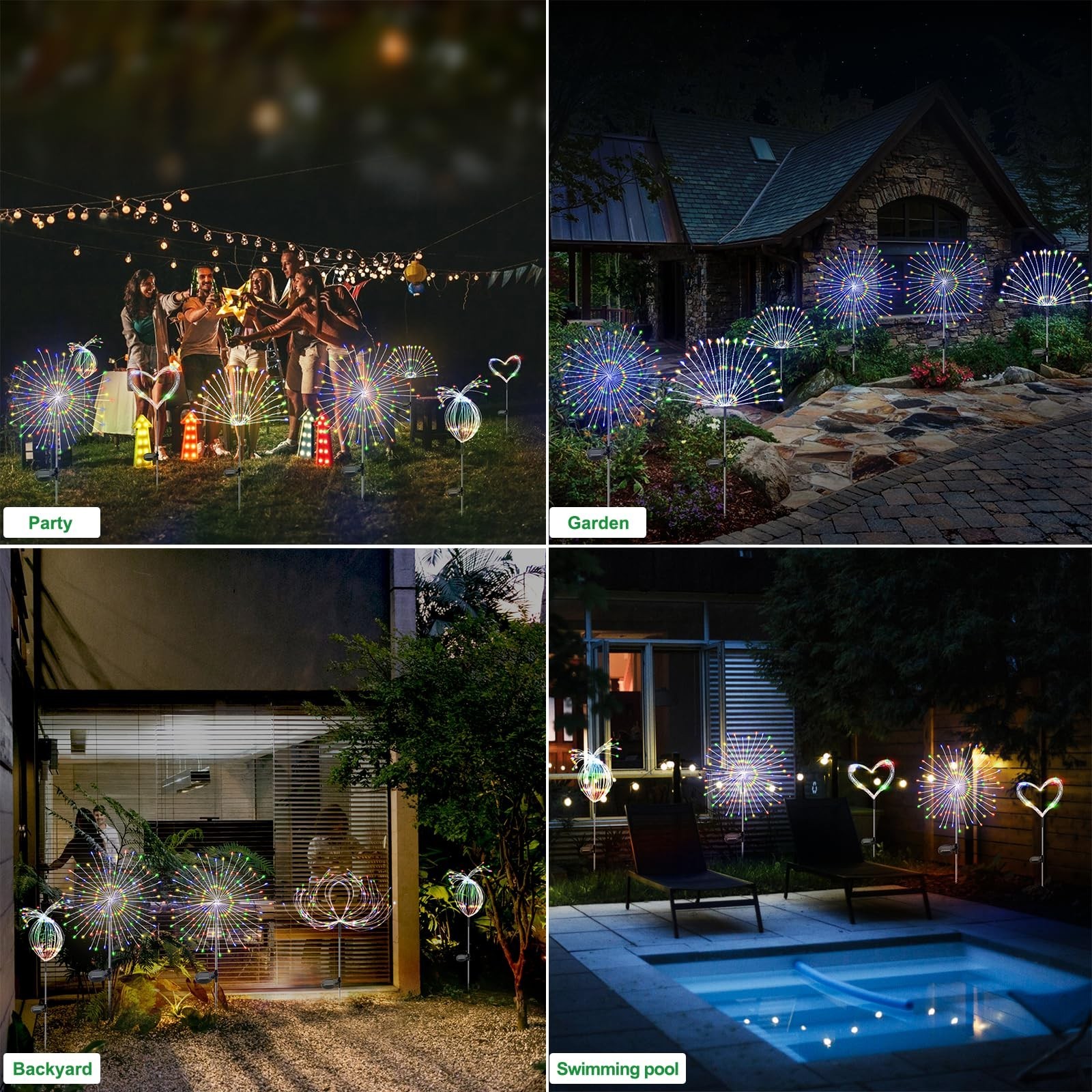 Solar Garden Lights Outdoor Waterproof, 2 Pack 120 LED Solar Firework Lights Decorative Garden Décor Outside for Flowerbed Pathway Party Christmas Decoration, Multicolor Product Details Color: Multicolor Size: 2 Pack Brand: Slyuexu MPN: YF0005 UPC: Does not apply EAN: Does not apply Finish Type: Polished Product Dimensions: 1"D x 1"W x 37.4"H Item Weight: 0.3 Kilograms Lamp Type: LED Shade Color: Multicolor Finish Type: Polished Product Dimensions: 1"D x 1"W x 37.4"H Item Weight: 0.3 Kilograms Lamp Type: LED Shade Color: Multicolor Shade Material: Aluminum Switch Type: Touch Style: Modern Brand: Slyuexu Color: Multicolor Light Source Type: LED Material: Plastic Room Type: Garden Recommended Uses For Product: Solar Garden Lights, Garden Deco, Solar Lights Outdoor Waterproof, Solar Lights for Outside Garden Yard Pathway Fence Power Source: Solar Powered Shape: DIY any shape Number of Light Sources: 120 Included Components: Solar Garden Lights Is Waterproof: True Bulb Shape Size: F10 Mounting Type: Floor Mount Number of Items: 2 Lighting Method: LED Control Method: Touch Indoor/Outdoor Usage: Outdoor Specific Uses For Product: Pathway Water Resistance Level: Water Repellent Number of Pieces: 2 Efficiency: Highly Efficient Voltage: 2 Volts Is Cordless?: Yes Size: 2 Pack Manufacturer: Yifan Part Number: YF0005 Item Weight: 10.5 ounces Item model number: YF0005 Finish: Polished Batteries Included?: No Batteries Required?: No Warranty Description: 1 year. Date First Available: December 11, 2023 120 LED Solar Lights for Outside: Our decorative solar garden lights have 120 LED beads, more beautiful and brighter than the other fireworks lights with 105 beads. You can DIY any shape as you like to creat a beautiful and colorful light spots lifelike fireworks, lighting up your beautiful garden, yard, sidewalk, etc. Solar-Powered and Waterproof: These outdoor solar lights are powered by solar energys and waterproof. They charge during the day and automatically illuminate at night, providing long-lasting and energy-efficient lighting. Designed to withstand all weather conditions, these outdoor decorations lights are waterproof and suitable for year-round outdoor use. Impressive Garden Decor with DIY: These solar lights outdoor for decorations effortlessly enhance your garden decor, these solar lights are suitable for pathways, gardens, front porches, and backyard decor, ideal for various outdoor activities. With flexible copper wire, you can DIY any shape, such as fireworks, flowers, heart, spiral, spherical. These solar string lights will brings you unlimited surprises. Easy to Install and Use: These pathway decoration lights are easy to install with no wiring required. Super easy to use because no cables or plugs are needed, just plant the solar lights in your garden, and turn the switch on to enjoy the most beautiful solar decorative lights in the world.