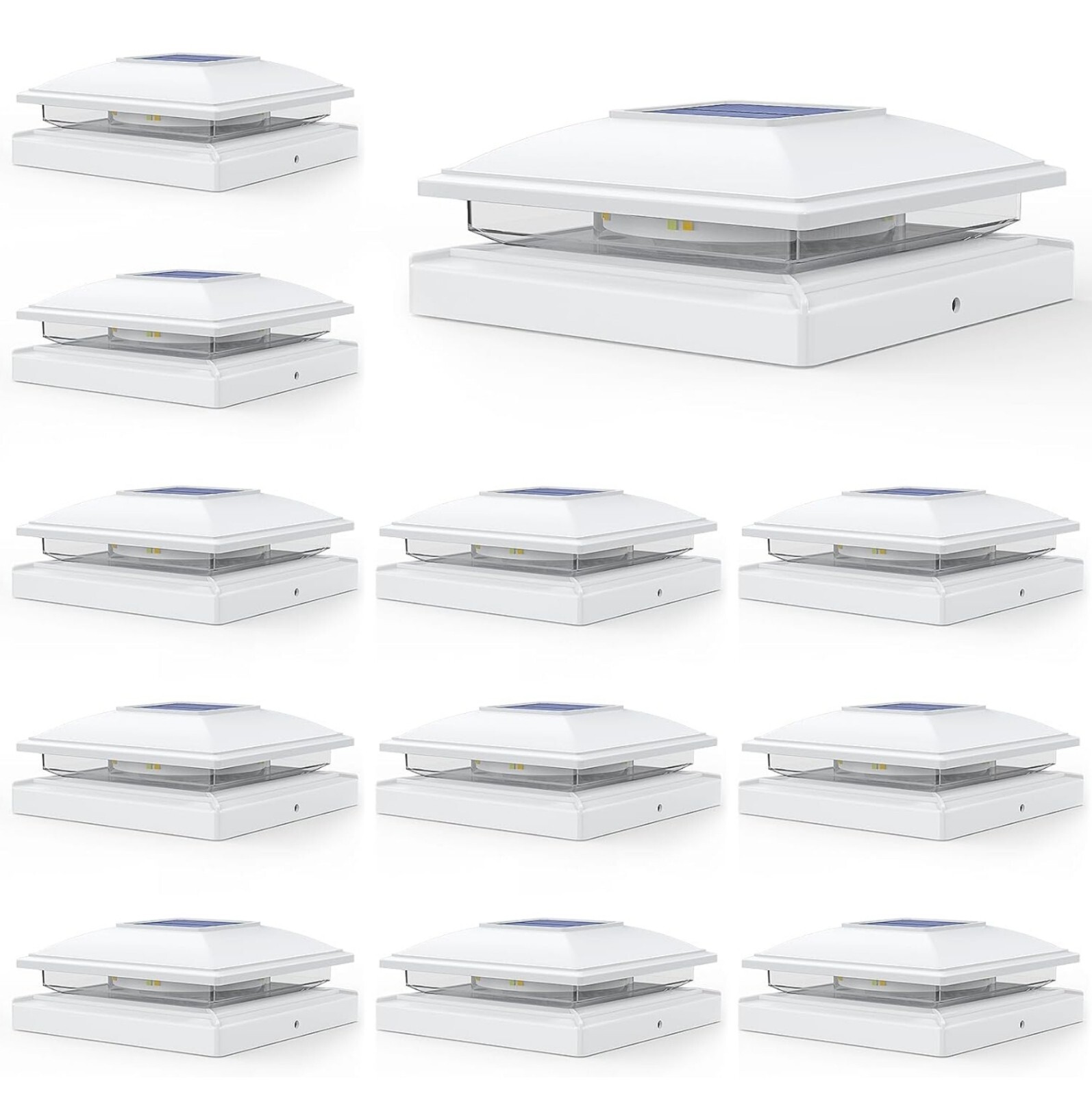 B085071625: APONUO Solar Post Cap Lights12 Pack Fence Post Solar Lights 2Modes Bright Outdoor Waterproof Garden Patio Fence Deck Post Lights Solar Powered for Fence Deck Caps 4x46x6 Wood4x45x5 Vinyl Applicable Sizes:APONUO solar post cap lights measure 5.71 x 5.71 x 2.64 inches and include screw fittings with multiple base options. Compatible with 4x4, 6x6 (actual 3.5x3.5, 5.5x5.5 inches) wooden posts and 4x4, 5x5 (actual 4x4, 5x5 inches) vinyl posts, ensuring a secure and versatile fit for various outdoor post Dual Lighting Modes – Warm White & Cool White:Featuring 16 LED beads, APONUO solar fence post lights offer two color modes—warm white and cool white—emitting 20 lumens of bright light at dusk. These 4x4 post solar lights create an inviting ambiance, perfect for garden décor, patio accents, deck lighting, and fence illumination Durable & Weatherproof for Outdoor Use:Crafted from high-quality PP plastic, APONUO solar post lights are IP64 waterproof, pressure-resistant, and rust-proof, ensuring reliable performance in rain, snow, and extreme weather. Designed for long-lasting outdoor use without maintenance worries Efficient Solar Charging – All-Night Illumination:APONUO 4x4 solar post cap lights provide all-night lighting on a full charge. For optimal performance, install these deck post lights solar powered in a sunny location to maximize solar absorption and battery efficiency Elegant Outdoor Décor & Wide Application:Ideal for garden, patio, yard, fence, deck, porch, driveway, walkway, and more, APONUO 6x6 post cap solar light offers 360° illumination, enhancing your outdoor space with stylish and functional lighting