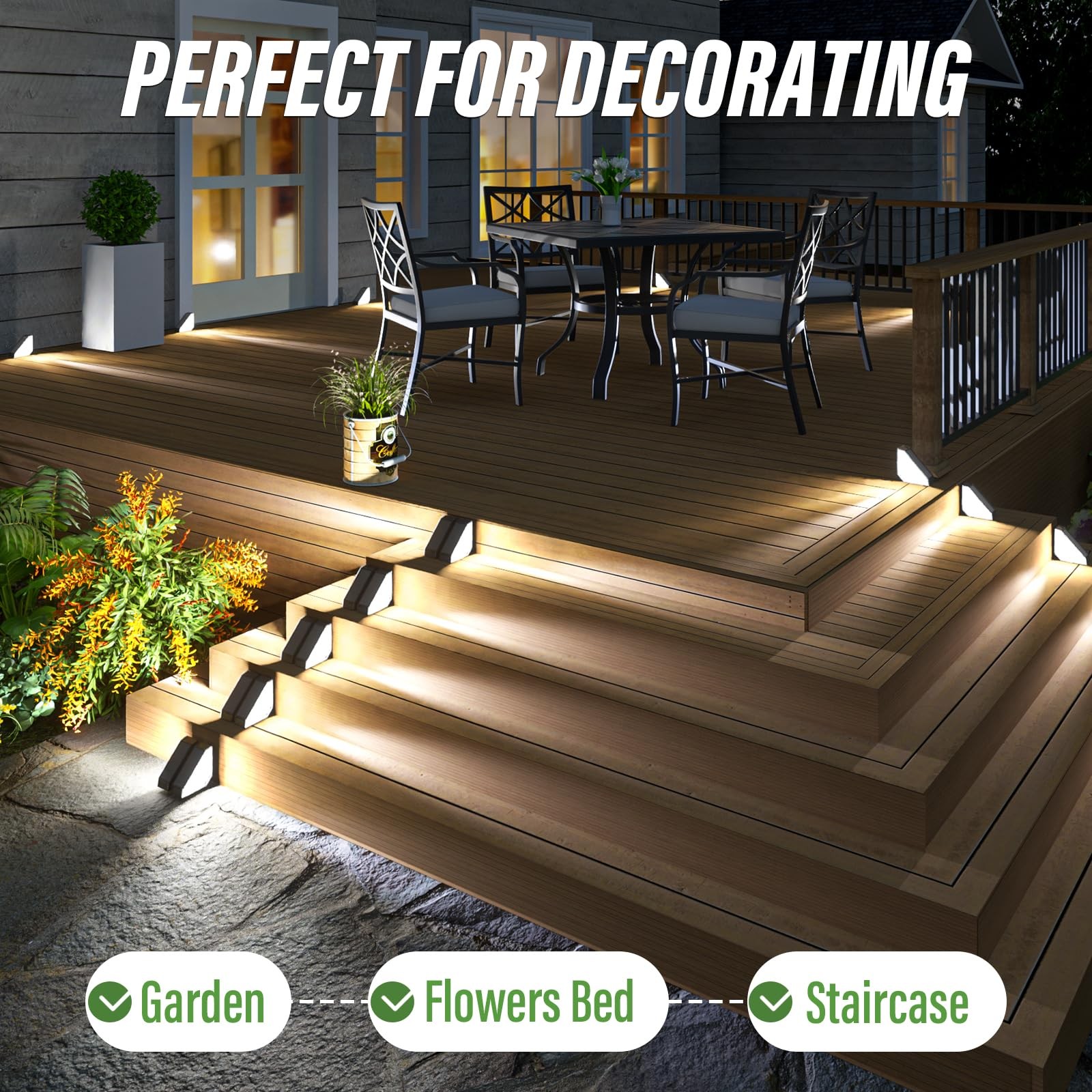 Solar Step Triangle Lights for Outside, Solar Outdoor Lights Porch Decor Products: Tips: 1. The charging efficiency depends on the temperature and the duration of direct sunlight. In winter, the sun's heat and temperature are relatively low, resulting in slightly shorter lighting time compared to summer. This is a normal occurrence, and we appreciate your understanding in advance. 2. Please don't hesitate to reach out to us with any issues or concerns. We offer a 180-day guarantee and technical support for every customer. Product Information: Material: Solar garden step decor lights are made of hard and durable ABS housing and high-quality solar panels can withstand various weather conditions such as rain, snow, and hot weather. Light Mode: Bright COOL WHITE or Soft WARM lighting modes. Waterproof Rate: IP65 Waterproof outdoor solar lights. Working Principle: Built-in light sensor enables automatic turn-on at night and turn-off and charging during the daytime. No manual operation is required. The stair decoration lights are solar powered, eliminating the need for a power supply and electricity bills. (Charge for 6 hours, work for 8 hours.) High-speed Charge Outdoor Lights: Outdoor deck stair lights are uniquely designed with high-efficiency solar panels, achieving a conversion efficiency of up to 18%, ensuring perfect working performance. Through a photosensitive sensor, it collects solar energy all day and they can turn on the light automatically at dusk and turn it off when it's dawn. It can be lit for 8-10 hours and the charging time only takes 6-8 hours. Durable Waterproof: LED lights for stairways IP65 waterproof, solar garden step decor lights are made of hard and durable ABS housing and high-quality solar panels, and waterproof solar outdoor lights for fences can withstand various weather conditions such as rain, and snow. Tips: If you intend to bring outdoor sidewalk lights indoors in the winter, you can place them on the indoor steps without sticky tape. Widespread Use: Outdoor solar backyard decor lights are suitable for front doors, walls, fences, deck railing, stairs, paths, gardens, terraces, and other lighting places, can also be used for fence posts, patios, courtyards, porch steps, driveways, garages, pet cabins, and other decorative. Solar-powered deck step lights are a nice choice for Easter, Halloween, Thanksgiving Day, and Christmas, Mother's Day, Father's Day, everyday surprises. Easy Installation: No wiring required, solar outdoor lights for steps are perfectly decored on garden stairs, front step, fence post, deck, porch step, etc. The triangle solar outdoor lights go in the corners so they are not in the way. Don't worry about stepping and tripping. Directly attached to the stairs by 3-M sticky tape, easy to operate, so don't worry about installation trouble. Tips: Solar stair lights need to be installed in a sunny spot. 180 Days Long Worry Guarantee: We offer a 180-day worry guarantee for our garden decor for the outside. Please don't hesitate to contact us If you encounter any issues or have any concerns with your Plant Stands, and we are committed to providing you with a satisfactory solution.