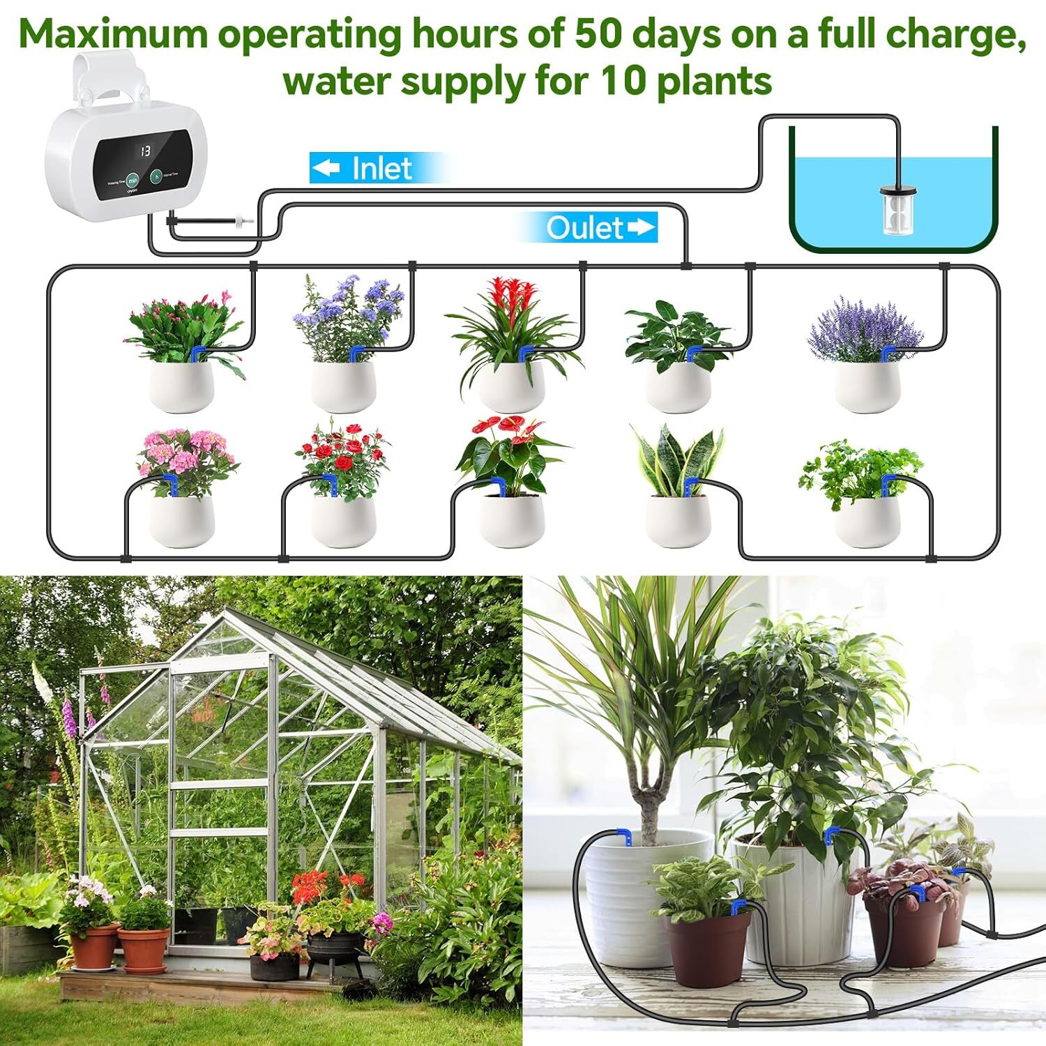 [Indoor USB irrigation system kit] The indoor USB irrigation system kit requires a fixed power supply to keep the drip irrigation system running and is designed for potted plants in an indoor environment. Set the watering time and interval according to the required amount of water needed by the plant and it will run and work automatically. Free your hands and save your time and energy for plant maintenance. 【室内USB灌溉系统套件】室内USB灌溉系统套件需要一个固定的电源来保持滴灌系统的运行,是为室内环境中的盆栽植物设计的。根据工厂所需水量设置浇水时间和间隔,它将自动运行和工作。解放您的双手,节省您维护工厂的时间和精力。 [More Choices] The automatic watering system has up to 300 watering programmes, watering time can be chosen between 1-30 minutes, and intervals of 3h, 6h, 12h, 1d, 2d, 3d, 4d, 5d, 6d, 7d in 10 steps, which can satisfy most of the plants' different needs for water, and give you more choices. 【更多选择】自动浇水系统有多达300个浇水程序,浇水时间1-30分钟可选,间隔时间3h、6h、12h、1d、2d、3d、4d、5d、6d、7d分10步可选,能满足大部分植物对水的不同需求,给您更多选择。 [Water-saving design] Unique drip head design and plus automatic watering system watering flow rate of 400ml/min, can deliver water evenly and slowly to plant roots, deep drip irrigation, compared with traditional drip irrigation methods, greatly reduce the over-absorption of plants, saving 70% of water resources, preventing the waste of water resources. 【节水设计】独特的滴头设计并加自动浇水系统,浇水流量400ml/min,可将水均匀缓慢地输送到植物根部,深度滴灌,与传统滴灌方式相比,大大减少了植物的过度吸收,节约水资源70%,防止了水资源的浪费。 [Type-c charging] This garden irrigation system is equipped with a Type-C charging port, which is in line with the latest trend in charging technology and ensures convenience and compatibility with most sockets. Once you've prepared a sufficient water supply and set up a watering programme, the automatic drip irrigation kits will automatically drip irrigate your plants while you're away. 【Type-c充电】本庭园灌溉系统配备了Type-c充电接口,符合充电技术的最新趋势,方便且兼容大多数插座。一旦你准备好了充足的水源并设定了浇水计划,自动滴灌套件就会在你不在的时候自动滴灌你的植物。 [Easy to install] By investing in the water irrigation system, you will get a complete drip irrigation kit without having to buy additional items. Installation is easy by scanning the QR code above the instruction manual and use our drip irrigation kits to immerse yourself in the garden irrigation system and effortlessly provide the best care for your plants. 【易于安装】通过投资灌溉系统,你将得到一个完整的滴灌套件,而无需购买额外的物品。只需扫描说明书上方的二维码即可轻松安装,并使用我们的滴灌套件,让自己沉浸在花园灌溉系统中,毫不费力地为您的植物提供最佳护理。