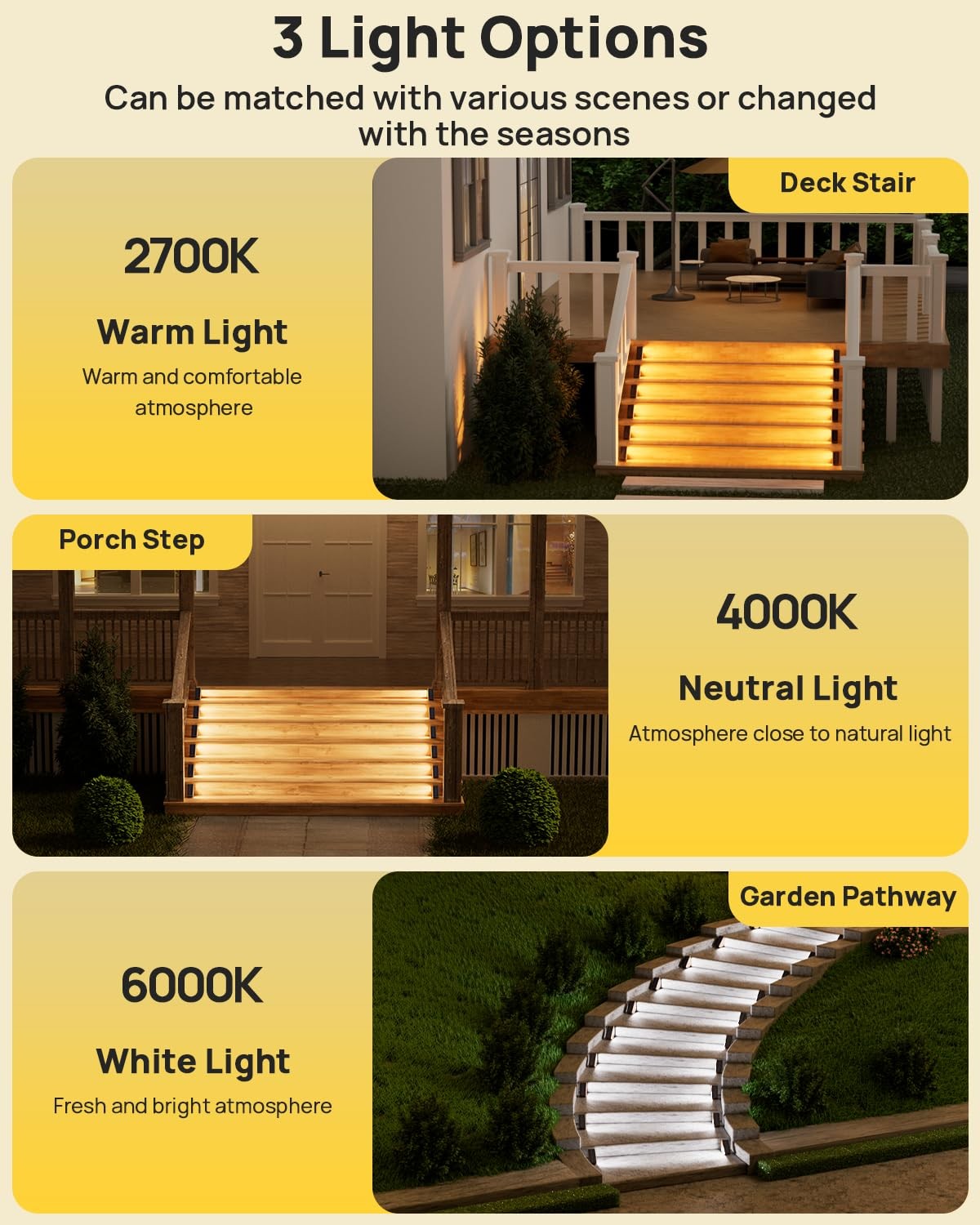 Solar Stair Lights 6 Pack, Solar Step Lights Outdoor Waterproof IP67, LED Outdoor Step Lights, Solar Outdoor Lights Decor for Garden Stair, Deck, Front Step, Front Porch and Patio (Warm White) 【Stylish and Functional】Solar step light can create a bright beam of light on each step, allowing every inch of the stairs to be clearly visible and reducing the risk of accidents or falls. Additionally, these step light outdoor can enhance the aesthetic appeal of the patio step, improving the overall appearance of outdoor steps. Don't settle for ordinary outdoor step lighting – upgrade to super lighting solar stair lights and enjoy the perfect combination of style and functionality. 【Super Lighting】 28 LEDs/200 Lumens. Solar stair lights outdoor offer 8H illumination for your garden and yard stair after a full 5-hour charge, without the need for any external electricity or wiring. Outdoor stair lights can be paired with the other side of the stair to provide great lighting and create a warm atmosphere.(Please turn on the switch before charging so that the solar deck light can be charged. ) 【Waterproof IP67】Solar step lights outdoor waterproof led are made of high-quality ABS materials, fully enclosed integrated design, waterproof IP67, withstand various weather, containing rainstorm, snow and frost. Tips:If you intend to bring sidewalk lights indoors in the winter ,you can just place them on the steps without sticky tape ,according to your actuall situation. 【Easy Installation】No wiring required, solar lights for steps are perfectly decoyed on garden stairs, patio, yard, deck, porch step and sidewalk,etc. The triangle solar outdoor lights go in the corners so they are not in the way. No worry about stepping and tripping. 2 installation ways: 1)Directly attached to the stairs by 3-M sticky tape. 2)Fix the outdoor accessories on the stair by screws and bolts. 3 Color Temperature Lighting Mode: outdoor Solar stair light has three light color temperatures(2700K/4000K/6000K) adjustable. Solar step light can create a bright beam of light on each step, allowing every inch of the stairs to be clearly visible and reducing the risk of accidents or falls. Additionally, These outdoor step lights are available in two color options to perfectly match wooden or marble steps, enhancing the beauty of patio steps and improving the overall appearance of outdoor steps. 28LED/200Lumens: 2x Brighter and more concentrated than other brand’s step lights. These Solar outdoor stair lights offer 10H-15H illumination for your garden and yard stair after a full 5-hour charge in Sunlight, without the need for any external electricity or wiring. Outdoor stair lights can be paired with the other side of the stair to provide great lighting and create a warm atmosphere. IP67 Waterproof and Durable : The solar fence light has a tough ABS housing and high quality solar panels that can withstand heavy rain, high winds or snow storms. Don't worry about any weather damage to the product. Easy Installation: Mounts along any edge, you can fix this step lights with Double-sided tape or the screws included. The size is subtle enough to blend in easily to step,no worry about tripping. No wiring required, solar lights for steps are perfectly decored on garden stairs, patio, yard, deck, porch step and sidewalk etc. 100% Satisfaction Service: We proudly stand behind all of our products 100% and offer a full 2-year service for our solar patio light. This will cover you if the stair lights stop working or there are any defects within those 2 years.