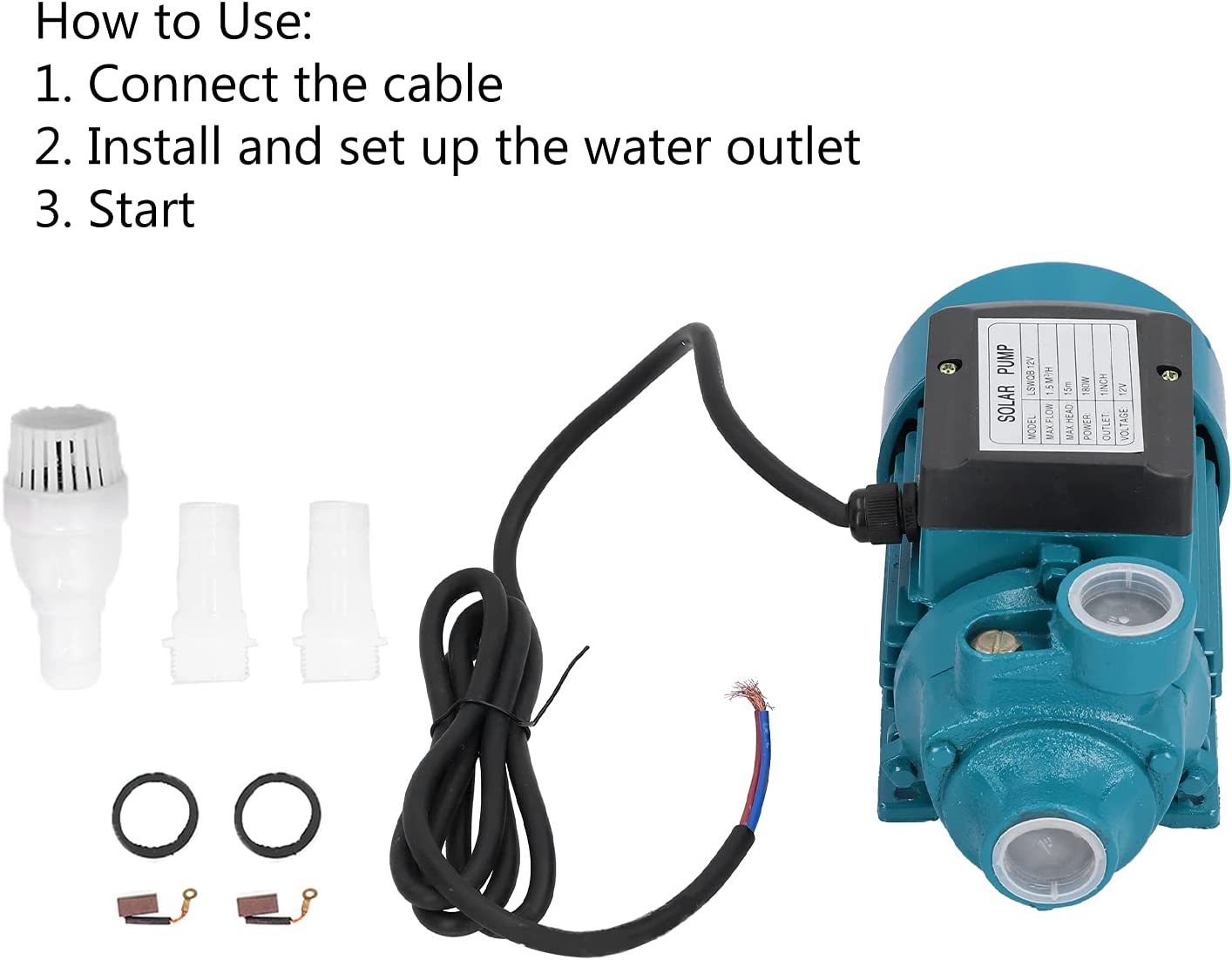 Store New Arrivals Add to Favorite View Feedback Solar Well Pump Kit, Lake Pump for Irrigation, DC 12V 180W Water Transfer Pump Unipolar Impeller Motor Pump for Garden Lawn Irrigation System, Lake Fountain - 1 Inch Outlet, 15M Head Description Item model number LSWQB-12V Part Number Cuque2b78cfr0w61721 Style Above Ground Maximum Lifting Height 49.2 Feet Power Source Solar Powered Item Package Quantity 1 Color Stainless Steel Brand Naroote Material Aluminum, Stainless Steel Country of Origin China Batteries Required? No Item Weight 7.79 pounds Maximum Flow Rate 1.5 Cubic Meters Per Hour Batteries Included? No Voltage 12 Volts (DC) Manufacturer Meiyya Product Dimensions 0.39 x 0.39 x 0.39 inches Included Components inc 【Versatile Water Supply Solution】This solar well pump is designed to meet various water supply needs. It's perfect for household pressurized water supply, agricultural sprinkler irrigation, boiler water supply, and more. 【Compact and Lightweight】The water transfer pump features a compact structure, small size, and lightweight design, making it easy to handle and transport. It's convenient to install and set up in different locations. 【Durable Construction】Made with a cast aluminum body and built-in stainless steel plate, this unipolar impeller motor pump is highly durable and wear-resistant. It ensures reliable performance even in demanding environments. 【Efficient Heat Dissipation】The horizontal single suction irrigation pump's ventilation design includes a fan cover, which promotes better heat dissipation during operation. This helps maintain the optimal performance and prolongs the pump's lifespan. 【Smooth and Quiet Operation】Equipped with a double ball bearing design, the motor runs smoothly and quietly. You can enjoy a noise-free water supply without any disturbances. Invest in this reliable and durable solar well pump to meet your water supply needs. Whether it's for household use, agricultural applications, or boiler water supply, this water transfer pump ensures efficient and hassle-free operation. With its compact size and lightweight design, it's easy to install and move as needed. The powerful motor and durable construction guarantee smooth and reliable performance. Order now and experience the convenience of a reliable water pump solution. Specifications: - Item Type: Water Pump - Material: Cast aluminum + brass + stainless steel - Model: LSWQB-12V - Voltage: DC12V - Maximum Flow: 1.5m³/H - Discharge Lift: Approx. 15m / 49.2ft - Power: 180W - Outlet: Approx. 1in - Application: Boiler water supply, underground water lifting, water tower water supply, farmland irrigation, solar water supply, water supply for households on floors How to Use: 1. Connect the cable: Begin by securely connecting the cable to the power source. 2. Install and set up the water outlet: Attach the appropriate water outlet for your specific application and make sure it is properly installed. 3. Start: Once all connections are complete, turn on the pump and enjoy a consistent water supply. Package List: - 1 x Water Pump - 3 x Outlet Pipe Joint - 2 x Black Gasket - 2 x Carbon Brush - 1 x User Manual ABOUT US We offer the best prices around on high quality products. Our E-store includes media such as books, movies, music and games while offering electronics, toys, sporting apparel, clothing, tools, general home, garden items and more. SHIPPING We are always working hard to ensure your package arrives as soon as possible. Please understand that some factors like weather, high postal traffic, and the performance of shipping companies are outside of our control. We offer free shipping to the lower 48 states and ship within 2 business days of payment, usually sooner. We do not accept P.O. Boxes. Please provide a physical address. RETURNS We offer a 30-Day Return Policy on items which you are not completely satisfied with. You have the option for a full-refund or an exchange of the item. No returns are available on items shipped outside of the USA. PAYMENT We accept PayPal. CONTACT US This page content is yet to come Please ad us to your favorite seller and visit again later Thank You