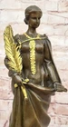 Condition : This sculpture is in perfect condition. Bronze Dimensions with Marble Base: Height 14" x Width 4.5" Marble Dimensions:4.5" X 4 Height without base:13" Weight:8 LBS Inventory: 71STE240BG4517 This symbolic bronze sculpture beautifully embodies the essence of peace and resilience. The woman stands with poise and strength, her arm firmly clutching a sword partially covered by a palm branch, a powerful representation of the delicate balance between war and peace. In her other hand, she holds a small lantern, illuminating the path forward with hope and wisdom. A smaller recast of the original "Peace" sculpture, this piece carries historical significance, as similar versions were produced during World War I. The intricate details bring depth to the sculpture, from the delicate folds of her garments to the fine textures of the sword and lantern, enhancing its artistic and symbolic value. Handcrafted from 100% bronze, this stunning work was cast using the traditional "Lost Wax Method," ensuring durability and precision. The rich brown patina accentuates its timeless appeal, and it is mounted on a black marble base for an elegant presentation. Signed by the artist J. Kassin, this sculpture is a compelling tribute to the enduring pursuit of peace. Athena Lady Wisdom Greek Goddess 100% Solid Bronze Sculpture Art Deco Statue Figurine STE-240BG Video will open in a new window Using the eBay App? Paste link into a browser window: [isdntekvideo]
