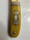 The Solingen Kiebitz 150 Monday Straight Razor is a high-quality shaving tool manufactured in Germany. It features an inlaid yellow and white handle, adding a touch of elegance to its design. This straight razor is designed for precision shaving and is a valuable addition to any shaving enthusiast's collection. The Solingen brand is well-known for producing top-notch shaving products, and this razor is no exception, showcasing German craftsmanship and quality.