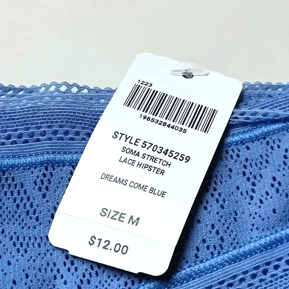 All photos are taken by Goob's Closet & Boutique and may not be reused without permission. This item is listed on multiple platforms and may sell elsewhere without notice. If you're interested, we recommend purchasing now to ensure availability. This hipster style panty offers full back coverage with a low rise, embracing your curves in all the right places. The all-over soft and stretchy sheer floral lace provides not only an elegant look but also a sensation of wearing nothing at all. The decorative trim lace at the waist and leg openings is designed to prevent any visible panty lines, keeping your silhouette sleek and smooth. With a commitment to the planet, this panty is partially made from recycled materials, merging style with environmental consciousness. Plus, the 100% cotton gusset is there to keep you feeling fresh and comfortable throughout the day. Details Hipster Style Full Back Coverage Low Rise All-Over Soft And Stretchy Sheer Floral Lace Decorative Trim Lace At Waist And Leg Openings Prevents Visible Panty Lines Made Partially from Recycled Materials 100% Cotton Gusset Style No. 570345259 Color: Dreams Come Blue Material Body: 52% Recycled Nylon, 26% Spandex, 22% Nylon Elastic: 67% Nylon 33% Spandex Gusset/Lining: 100% Cotton Care Machine Wash Measurements/Size Guide Soma Size S (Small) will fit US Size 4-6, Waist 28-29 inches, Hips 37.5-38.5 inches best. Soma Size M (Medium) will fit US Size 8-10, Waist 30-31 inches, Hips 39.5-40.5 inches best. Soma Size L (Large) will fit US Size 12-14, Waist 32.5-34 inches, Hips 42-43.5 inches best. Soma Size XL (Extra Large) will fit US Size 16-18, Waist 35.5-37 inches, Hips 45-46.5 inches best.