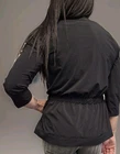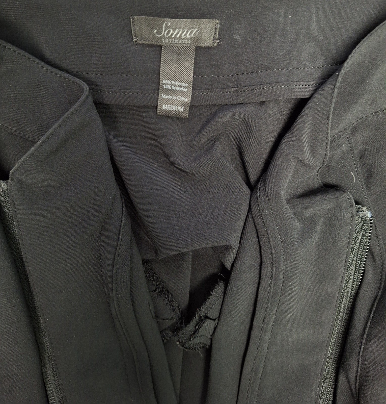 Crafted for the modern woman, the Soma Women's Medium Jacket in sleek black offers a blend of functionality and style. The jacket features a full-zip front, allowing for easy layering and versatile wear. Its cinch waist adds a touch of sophistication, molding the silhouette for a flattering look. The short-sleeve design keeps the jacket light and airy, perfect for transitioning from a casual daytime outing to an evening event. Made from durable polyester, this basic jacket is a timeless addition to any wardrobe, providing comfort and ease with every wear. Great condition