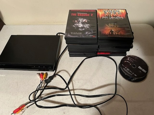 Here is a sony dvd player that works good and a lot of 20 dvd movies mostly horror movies or thrillers and 18 of them are in original cases as you see and 2 are without case, all work good and most only used 1 or 2 times, getting a good lot of movies if you like horror movies or thrillers, only had for when my grandson came to stay who liked horror movies, and the dvd player works good and cables with it ready to hook up and have a movie day, I live in clean and smoke free home. AND SELLING AS LOT ONLY WILL NOT BREAK UP.