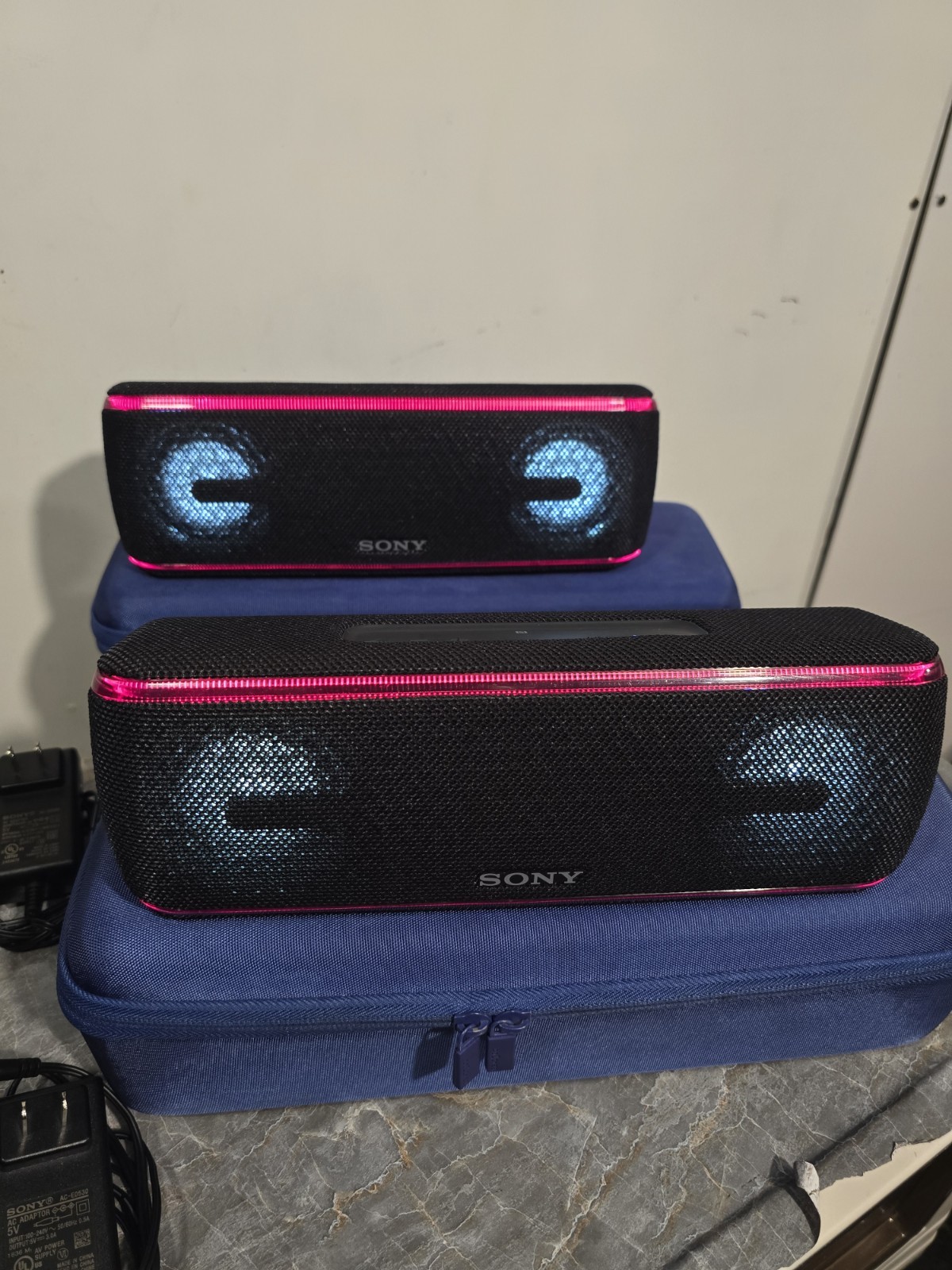 Used good condition Set of 2 Sony SRS-XB41 Black Portable bluetooth speakers. Had them since new. Battery life is still good. Never had any issues or problems with the speakers. No scratches or damages. Comes with original charger and blue carrying case. Has gaffers tape numbered 1 & 2 on the bottom of each. It's removable, but I'm leaving it as it makes it easier to identify each speaker. No box, no manual Ships with usps.