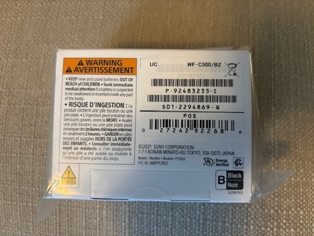 Sony WF-C500 Truly Wireless In-Ear Bluetooth Headphones - Black NEW Wireless earbuds, compact design, comfortable fit, good sound quality, secure fit, good sound isolation, small and lightweight, punchy bass, clear mids, and well-defined highs. DSEE technology enhances compressed audio, restoring high frequencies and detail, use Bluetooth 5.0 and support SBC and AAC codecs, fast pairing for iPhone, Android devices and Swift Pair for Windows PCs, up to 10 hours of battery life on a single charge, with the charging case providing an additional 20 hours, 10-minute quick charge provides an hour of playback, uses USB-C for charging and does not support wireless charging, physical buttons for playback, track control, volume adjustment, and access to voice assistants, have an IPX4 rating, making them resistant to splashes and sweat, support 360 Reality Audio and offer hands-free calling with built-in microphones, Sony Headphones Connect app allows for customization of settings, including EQ adjustments and DSEE activation.