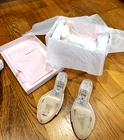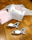 Paloma has had a makeover this season! With a transparent plexi wedge heel crafted in the shape of layered butterfly wings and adorned with crystals, this wedged mule has a simple upper and is crafted from ivory satin! Materials: Upper: 100% Textile; Outsole: 100% Leather Heel Height: 100mm Handmade In: Spain