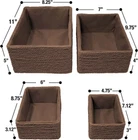 Product details The Sorbus Storage Baskets are the perfect way to organize your bathroom, vanity, or open shelving. This organizer bin set is versatile for any space. Organize your office, nursery, pantry, laundry room, and more. The paper rope material and soft design complement many home decor styles. Tuck away toiletries, nursery items, office supplies, snacks, laundry supplies, cosmetics, makeup, skincare, and more. This is an excellent set for small spaces, especially apartments and college dorm rooms. Maximize your storage possibilities with this four-piece set. It’s the perfect storage solution for any drawer, shelf, or tabletop, so you can stay organized in style. 4 Piece Basket Set — Organize household items in this basket set — Each set includes multiple sizes to compliment open shelving — Soft twisted / braided design with paper rope material Versatile for Any Space — Use in the bathroom, bedroom, closet, pantry, laundry room, dorm room, and more — Complements modern, rustic, farmhouse, retro, shabby chic, and more home decor styles Nesting Design — Smaller baskets fit inside larger baskets — Designed to be lightweight and easily transportable Design Details — Made of paper rope material & cardboard — Lightweight — Neutral and minimal style — Spot clean — Varying sizes of baskets — Measures approximately: Multifunctional — Organize cosmetics, toiletries, hair accessories, office supplies, makeup, skincare, bath products, and more
