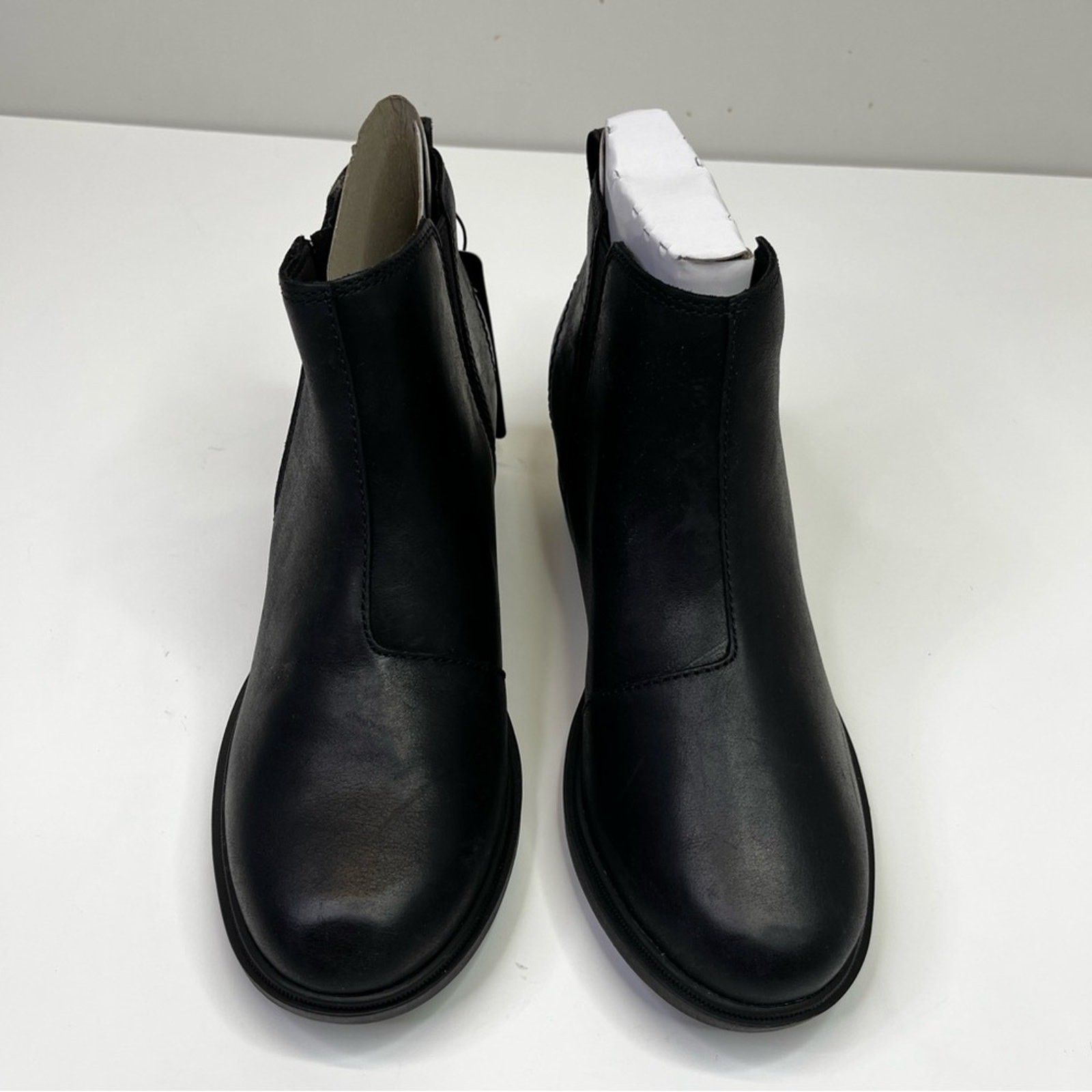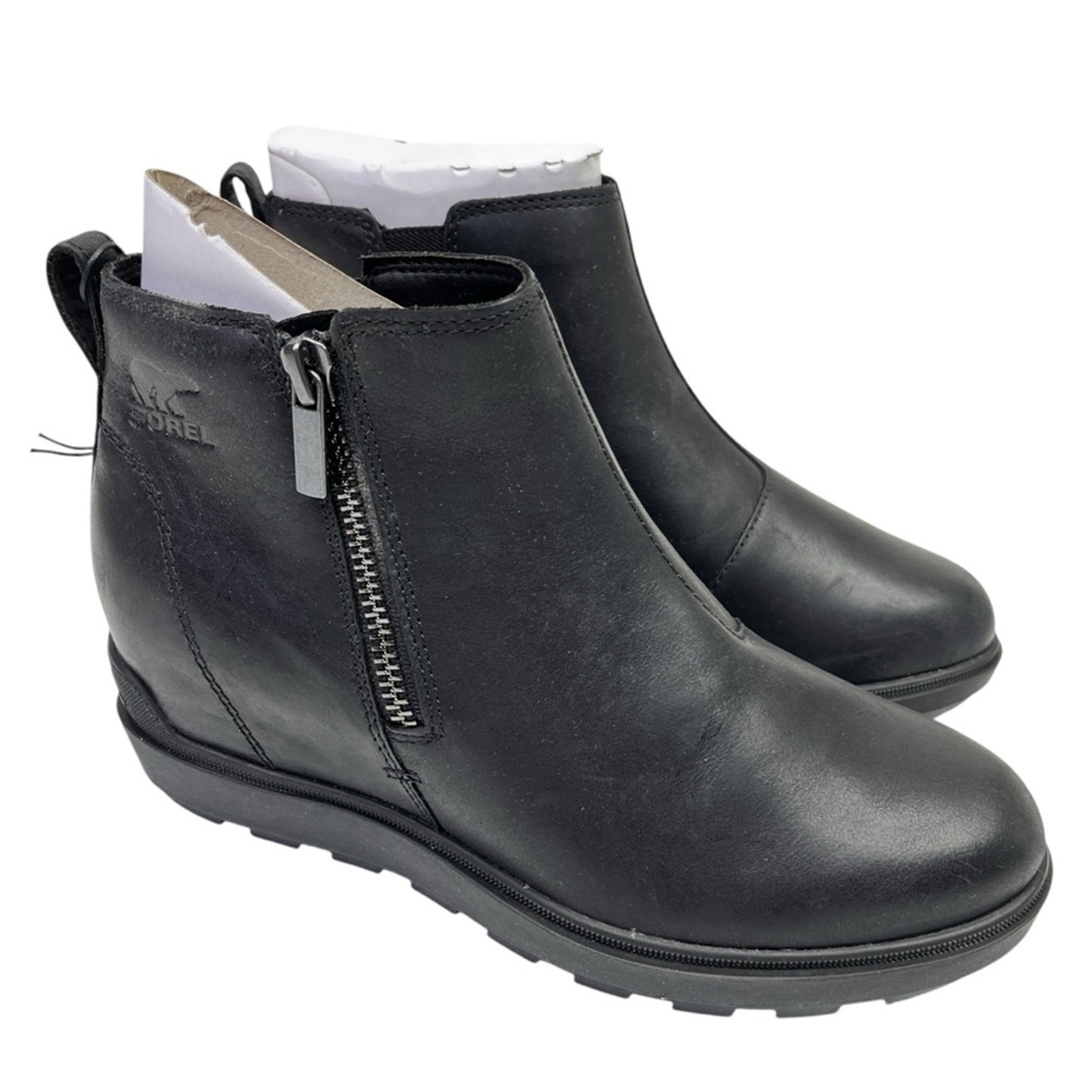 Sorel Evie II Zip Leather booties black - 7.5 Brand: Sorel Size: 7.5 Type: Booties Color: Black Closure: Zip Material: Leather Condition: New In Box (see photos for some markings during storage) Sorel Evie II Zip Leather Booties in black. Crafted from waterproof full-grain leather, they offer reliable protection. The lateral zipper ensures easy on and off. A removable molded EVA footbed with a textile topcover provides cushioning for all-day wear. Set on a 2-inch molded BPU-PU wedge and a durable molded rubber outsole, these booties deliver excellent traction and a comfortable lift. NWT - retail $150 Casual, Everyday, Minimalist, Chic, Trendy, Going Out, Closet Staple, Gorpcore, Grunge, Outdoor, Fall, Winter, Leather