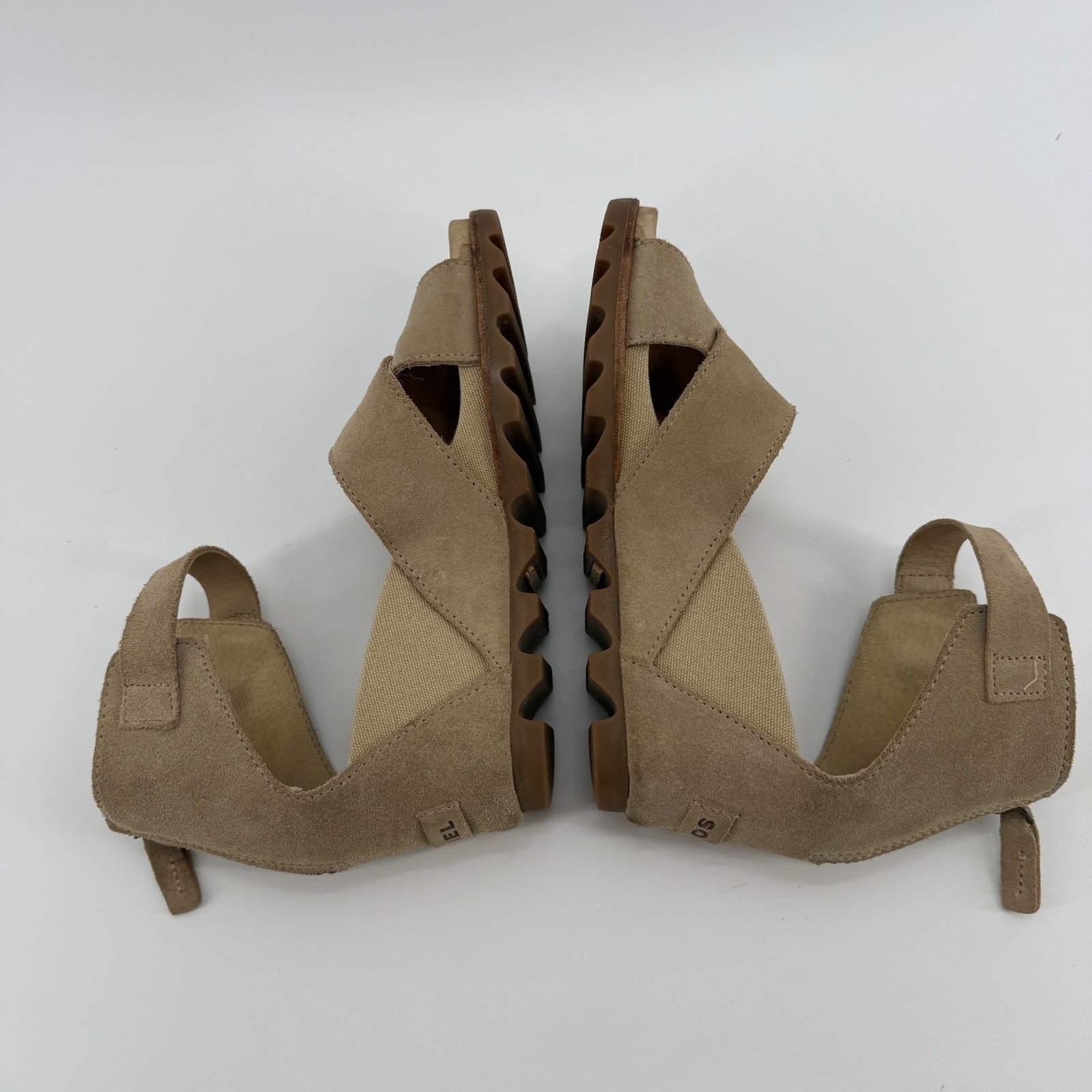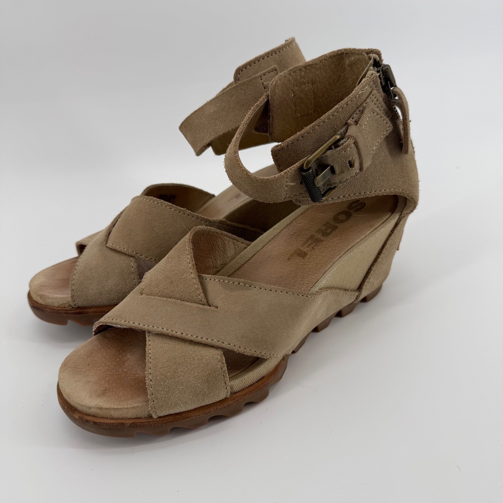 Overall good condition with a few blemishes as seen in pictures. Sorel women's tan suede wedge sandals with crisscross straps and an ankle strap featuring a buckle closure. These sandals have a convenient back zipper for easy on and off and a comfortable wedge heel. The brand name SOREL is visible on the footbed and the heel. Style: Strappy Department: Women Upper Material: Suede UK Shoe Size: 6 AU Shoe Size: 8 Heel Style: Wedge EU Shoe Size: 39 Features: Adjustable Strap, Buckle, Comfort, Straps, Cushioned Closure: Zip Pattern: Solid Accents: Zipper, Logo, Buckle Heel Height: Mid (2-2.9 in) Type: Sandal Product Line: Sorel Keywords: suede, tan, wedge, ankle strap, zipper closure, open toe, casual, summer, comfortable, fashion, footwear, chic