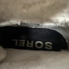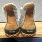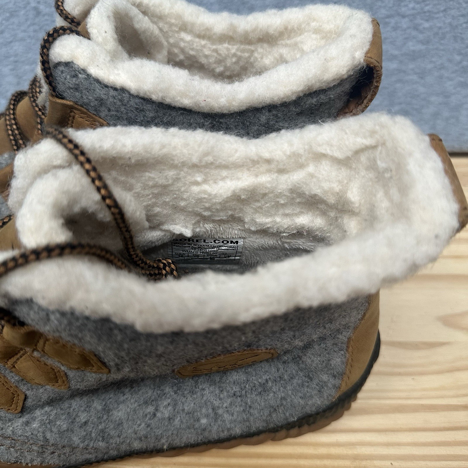 The Sorel Out N About Duck Boots in women's size 12 are a stylish and comfortable choice for winter wear. These grey wool ankle boots feature a round toe, lace-up closure, and flat heel for added comfort. The rubber outsole provides traction, making them ideal for casual occasions in colder weather. With their solid gray color and logo accents, these Sorel boots are a practical yet fashionable option for the season. There is a small marker spot on the tongue that is shown in the photos.
