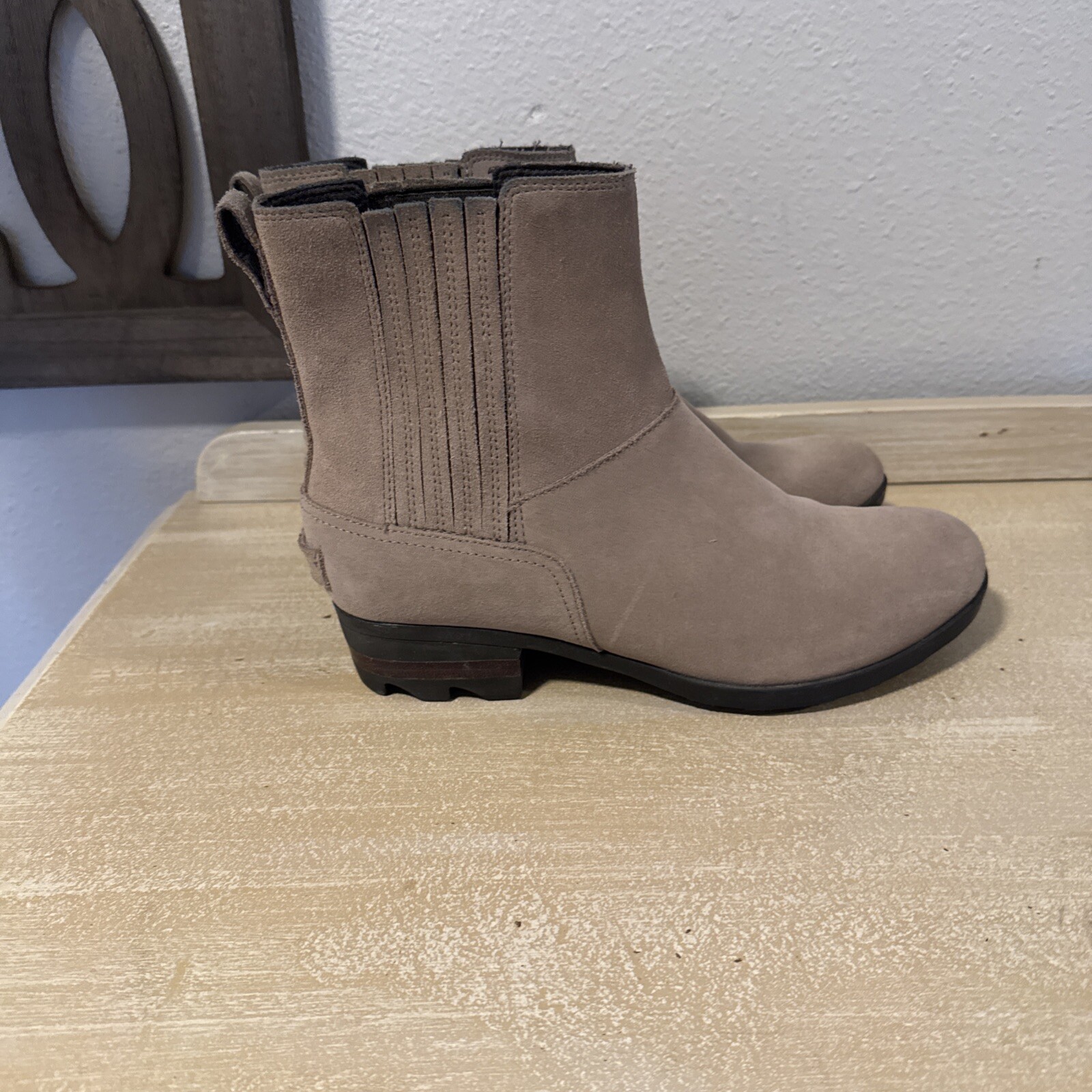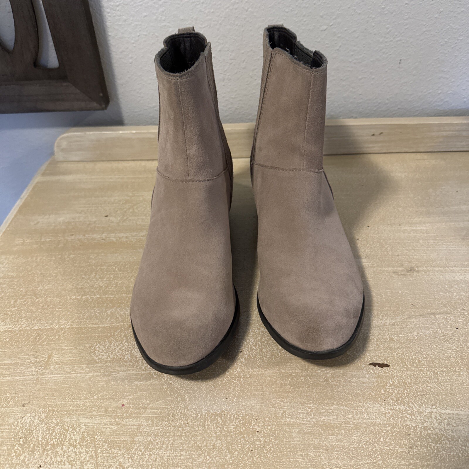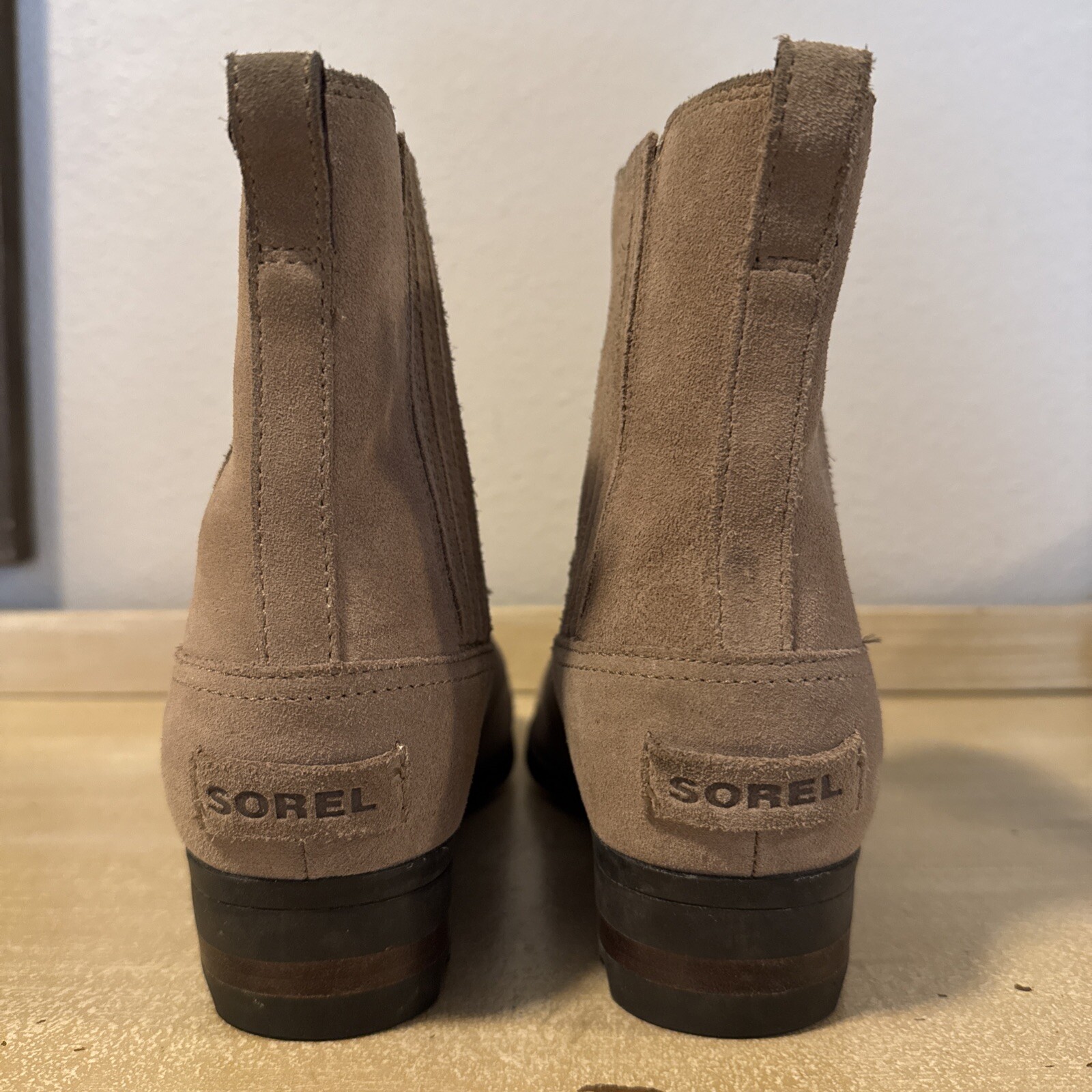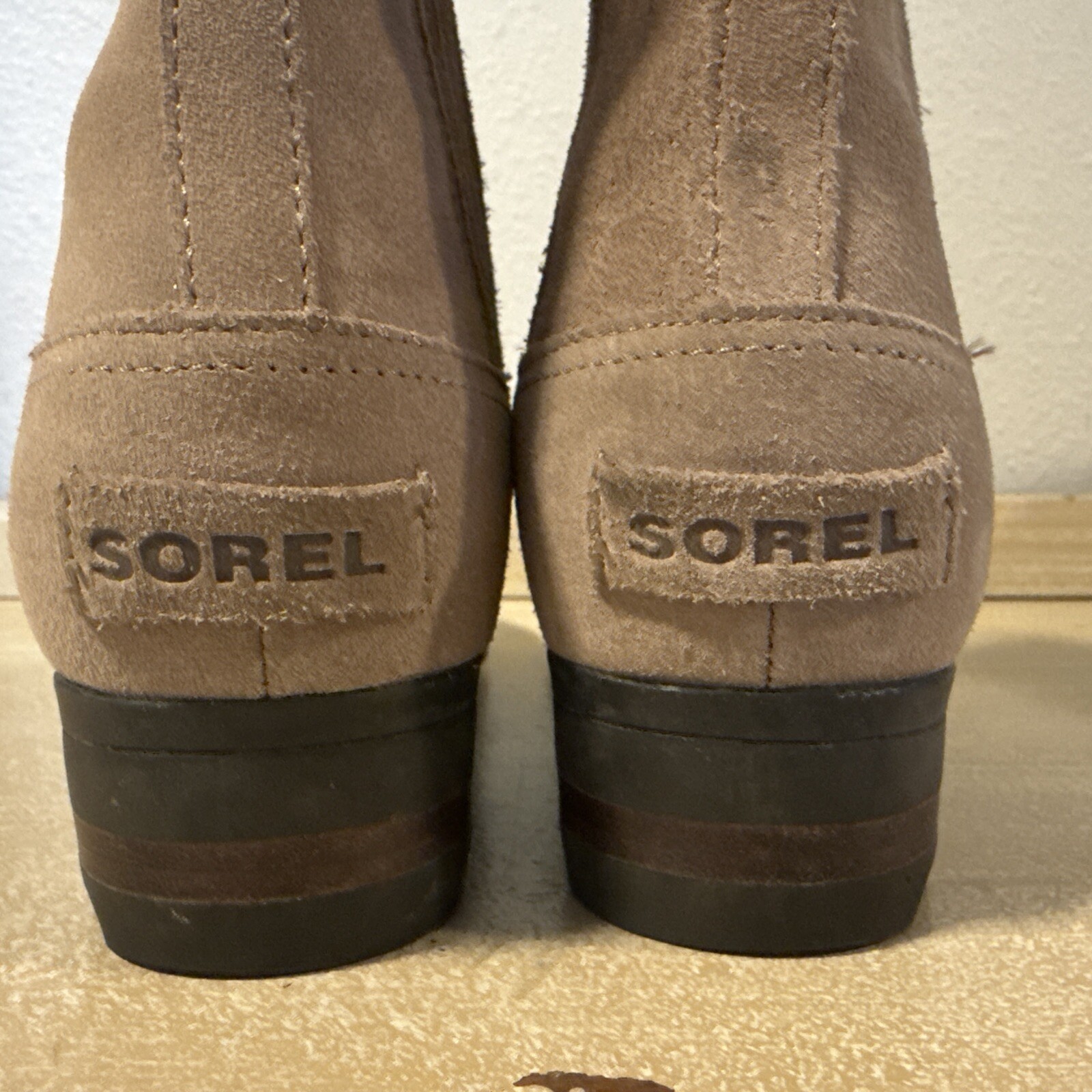 Sorel Suede Short Bootie in beige, women's size 9, worn only once. These ankle boots feature a rubber outsole for durability and a stylish suede upper. The booties are designed by Sorel, known for their high-quality footwear. Perfect for adding a touch of style and comfort to any outfit.
