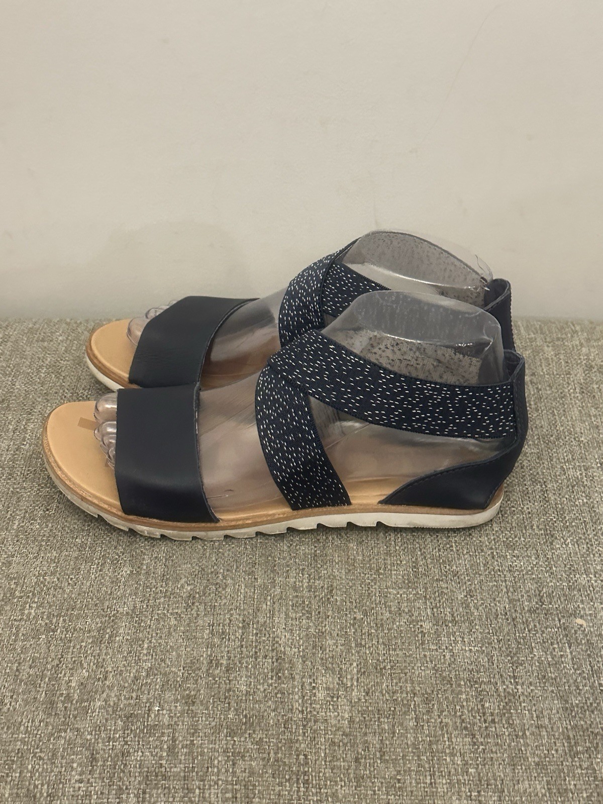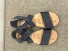 These Sorel Women’s Blue Gladiator Sandals in size 6 feature a geometric pattern, slip-on closure, and low heel for all-day comfort. The strappy design with accents of the brand logo adds a stylish touch to the sandals, making them perfect for casual wear. Made of synthetic materials, these sandals are designed with a flat heel and standard shoe width for a comfortable fit. The open toe model in a vibrant blue color is a versatile option for any woman's shoe collection. Preowned Good Condition