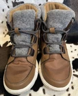 The perfect boot to shake up your style without slowing you down. This super lightweight pair features a waterproof textile upper with a felt cuff, 100g insulation, and an EVA footbed that feels like walking on clouds. It's eye-catching and adventure-ready, grounded by a grippy rubber sole that delivers the traction you need for slick city streets. • UPPER: A lightweight, sport inspired cosy boot. - Waterproof textile upper with either felt cuff or textile cuff. Waterproof synthetic in eyestay, toe and heel rand. Reflective webbing eyelets or plain webbing - Synthetic heel pull tab. - Microfleece lining. • INSULATION: 100g insulation. • FOOTBED: Molded EVA footbed with microfleece topcover. • MIDSOLE: Molded EVA with iconic SOREL scallops with rubber heel logo. • OUTSOLE: Outsole grade EVA with high traction rubber down the centre for better grip. No major flaws! Excellent condition! No original box!