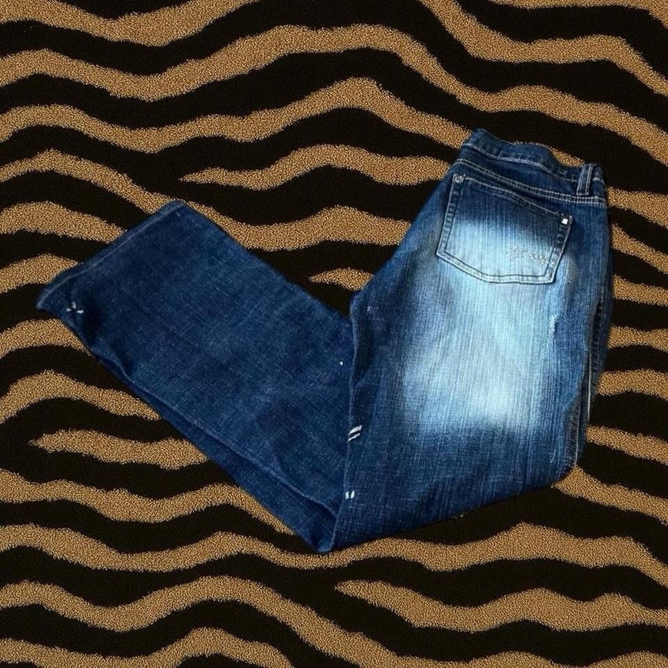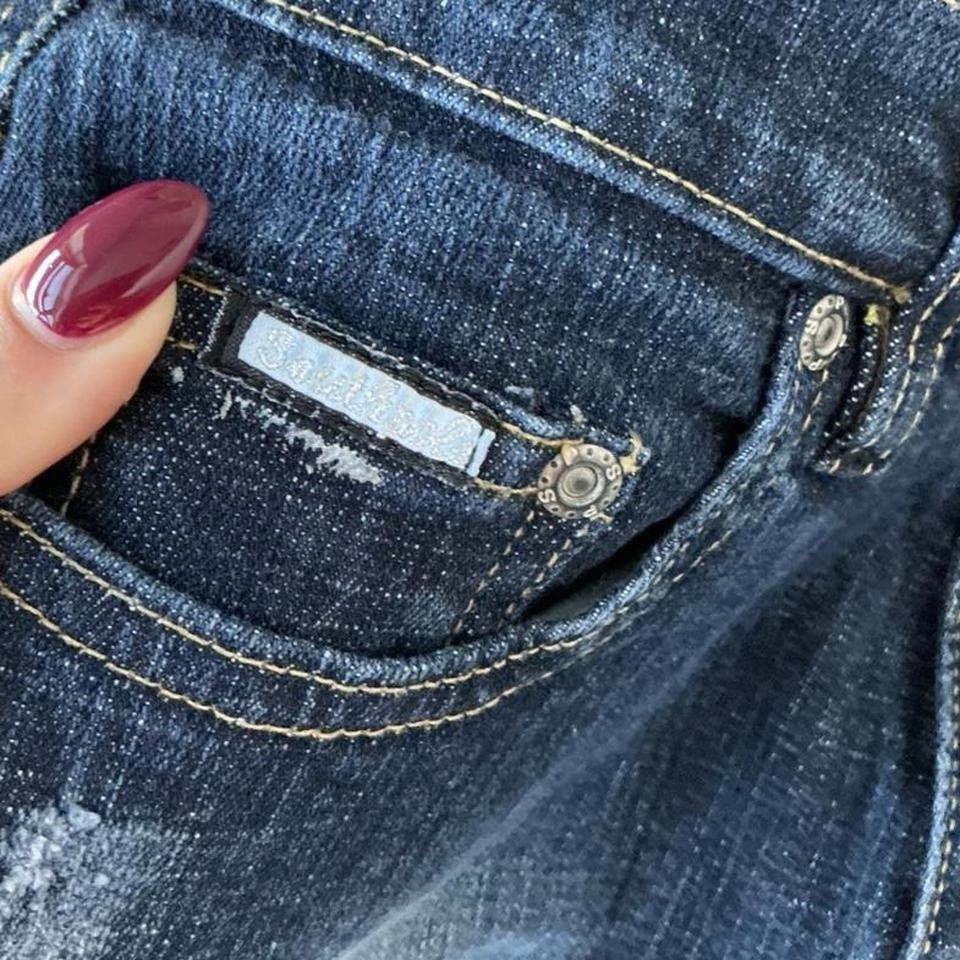 South Pole Distressed Low-Rise Flare Jeans – Size 7. Faux paint splatter, rhinestone back pocket details, and a faded wash. Front rise 8 1/2” · Waist 27” · Inseam 28” · Length 36 1/2” 💌 #y2k #grunge #2000s #streetwear #denim
