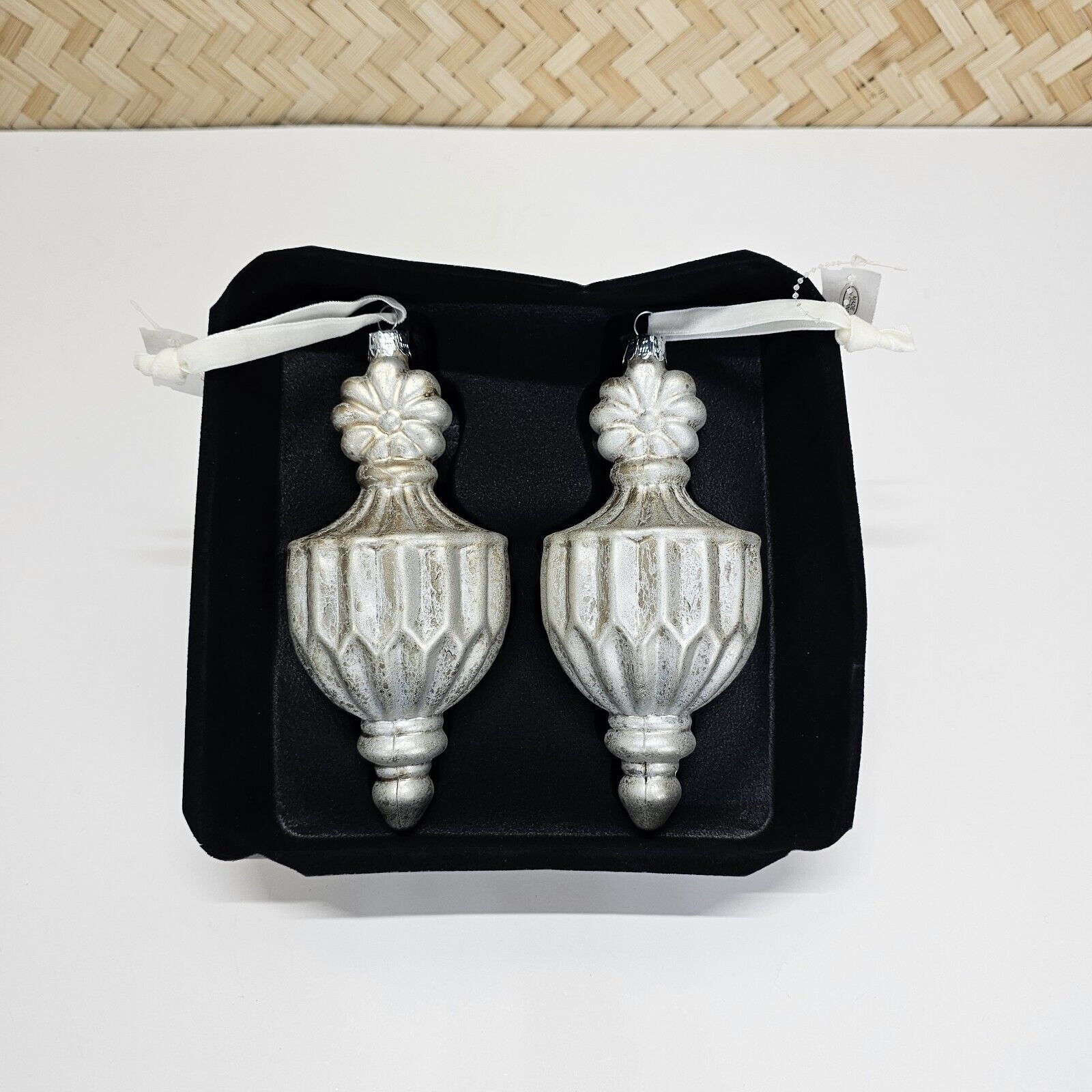 Gorgeous set of finial ornaments. New in box. Each ornament has an off white velvet ribbon hanger. Please see all pictures for details and measurements. If you have questions or would like more photos, I'm happy to help. Listing and template services provided by inkFrog
