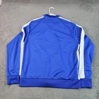 Brand: Southpole. Style: Mens full zip track jacket from the Southpole Authentic Collection. Color: Royal blue body with white contrast stripes along the shoulders and down the sleeves, and white front zipper. Size: Mens XL (interior neck tag marked XL). Material: Smooth polyester knit outer shell fabric. Country of origin: Made in China (interior neck label, RN 82628). Design details: Stand collar, full length front zipper closure with contrast trim, ribbed knit cuffs and waistband, and front welt hand pockets. Branding and logos: Small embroidered SP logo at left chest and woven Southpole Authentic Collection neck label. Features and use: Lightweight track-style jacket with striped sleeves, ribbed trim, and zip front ideal for activewear, gym and training, running, walking, or casual everyday layering.