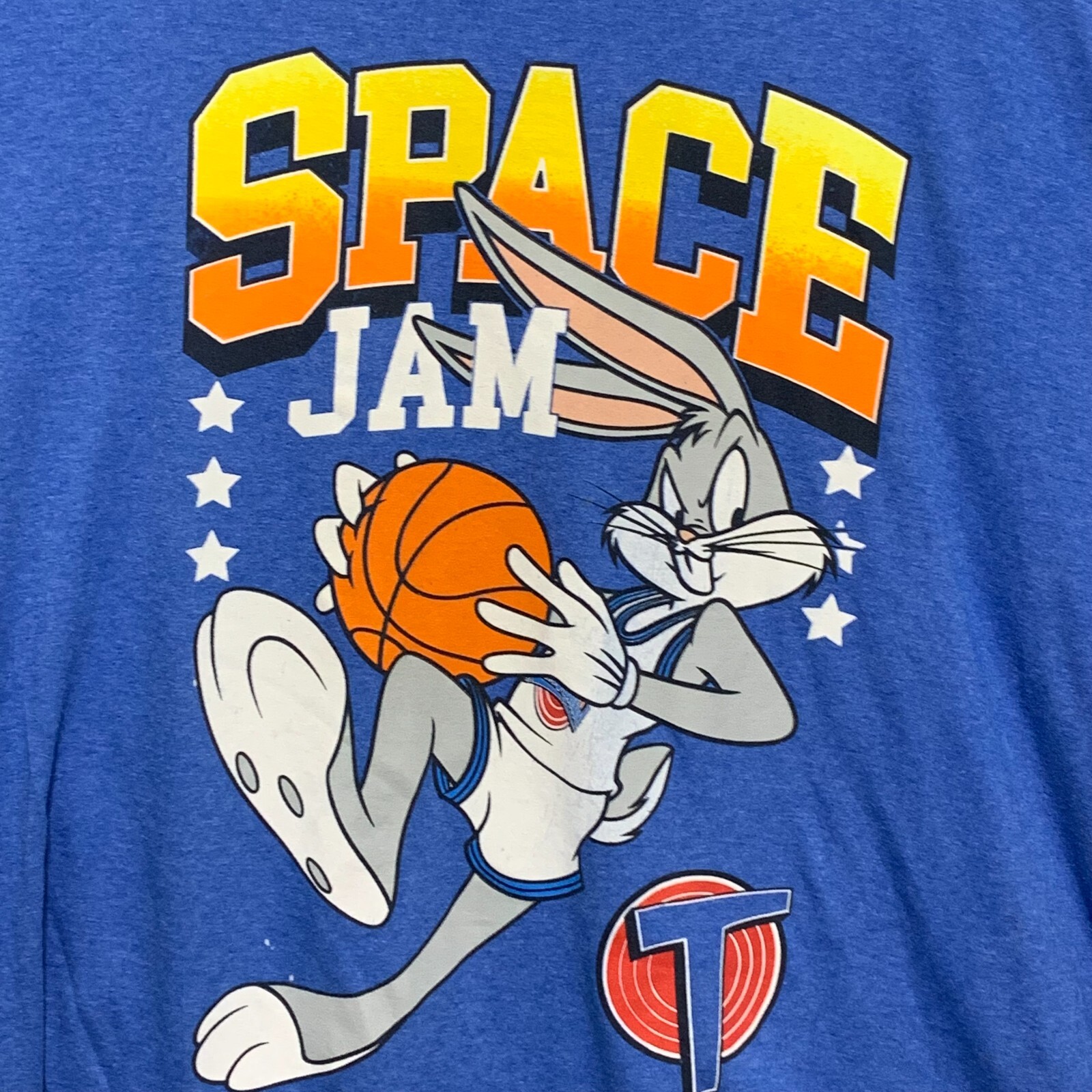 Show off your love for Space Jam and Bugs Bunny with this blue T-shirt. Perfect for men, this regular-sized shirt features short sleeves and a pullover design. The shirt is made from high-quality materials and comes in a 3XL size. The shirt's color is a vibrant blue, and it features the iconic Space Jam logo on the front along with Bugs Bunny. This T-shirt is perfect for any fan of the movie or Bugs Bunny. Add it to your wardrobe today and show off your unique style.