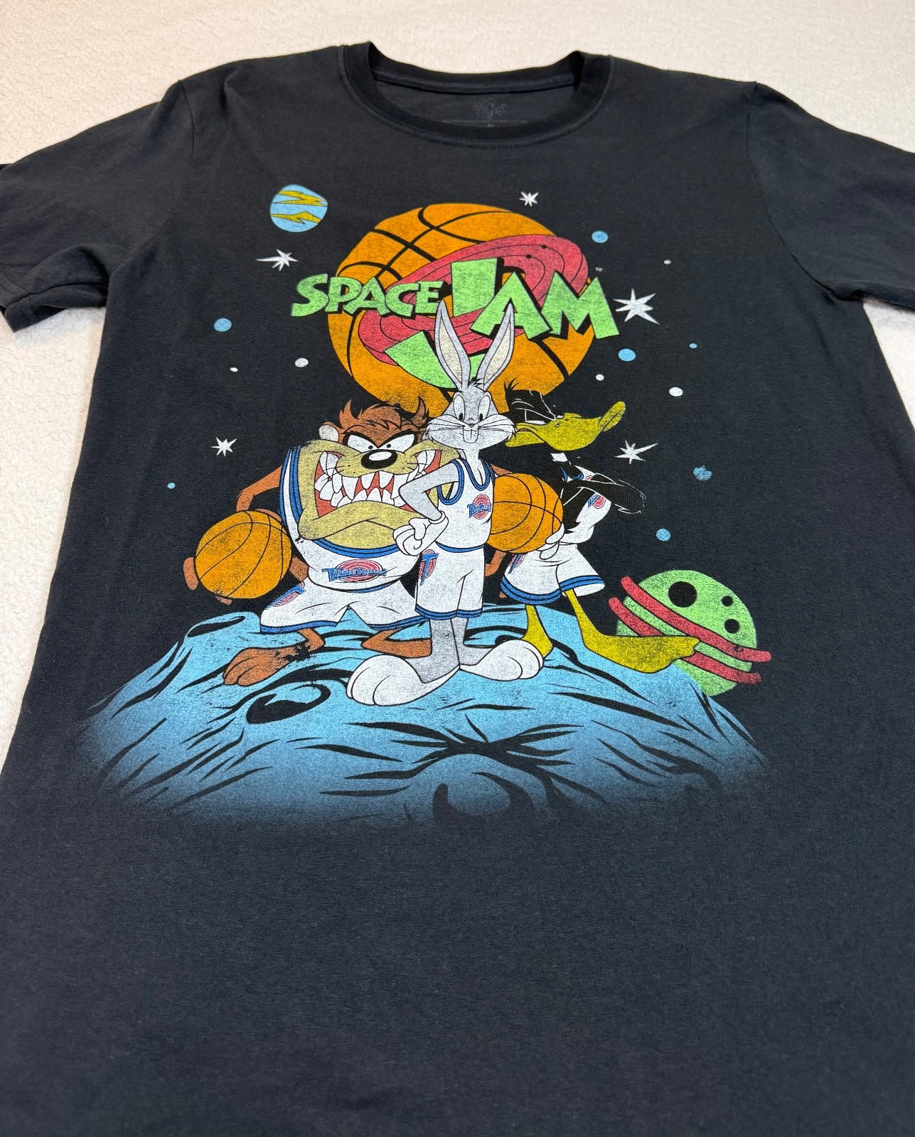 • Brand: Space Jam (Official Warner Bros. Merchandise) • Size: Medium • Color: Black with multicolor graphic • Material: 100% Cotton • Chest (pit-to-pit): ~19.5” • Length: ~29” • Fit: Standard unisex tee • Design: Bugs Bunny, Daffy Duck & Taz with basketball and outer space theme • Made in: Honduras • Care: Machine wash cold, tumble dry low. Details: • Vibrant multicolor print on soft black cotton • Iconic Space Jam logo with planet and basketball details • Lightweight, breathable feel perfect for everyday wear • Great piece for vintage, cartoon, or streetwear collections