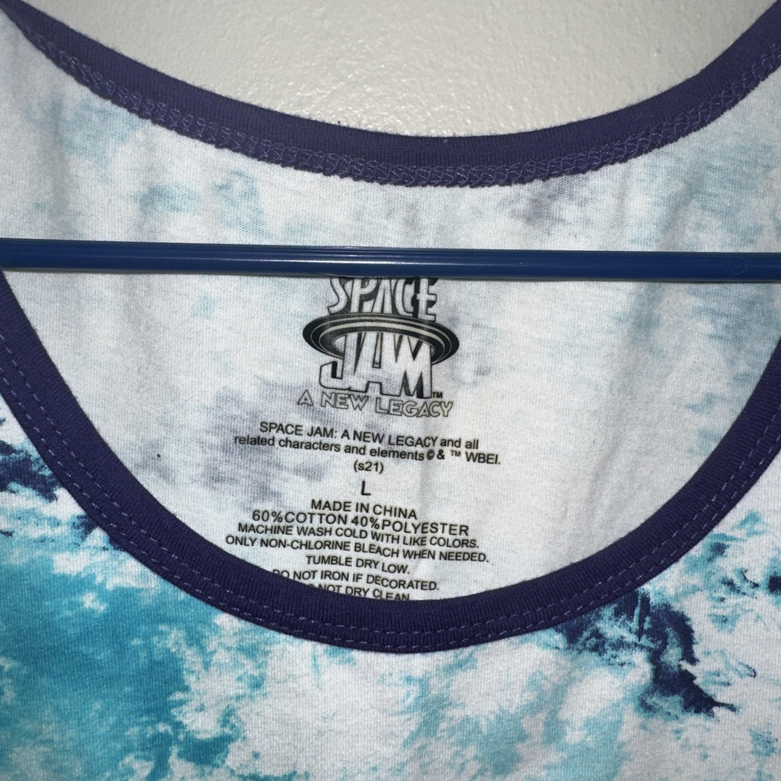 This Space Jam shirt is a men's size Large tank top featuring characters such as Porky Pig, Bugs Bunny, Daffy Duck, and Tazmania Devil from Looney Tunes and Warner Bros. The multicolor sleeveless tee has a crew neck and is made of lightweight cotton jersey fabric, suitable for summer, fall, and spring seasons. With a retro 90s cartoon theme, this casual T-shirt by Bioworld is machine washable and adorned with the Tune Squad and movie accents, making it a fun and easy-care addition to any fan's wardrobe.