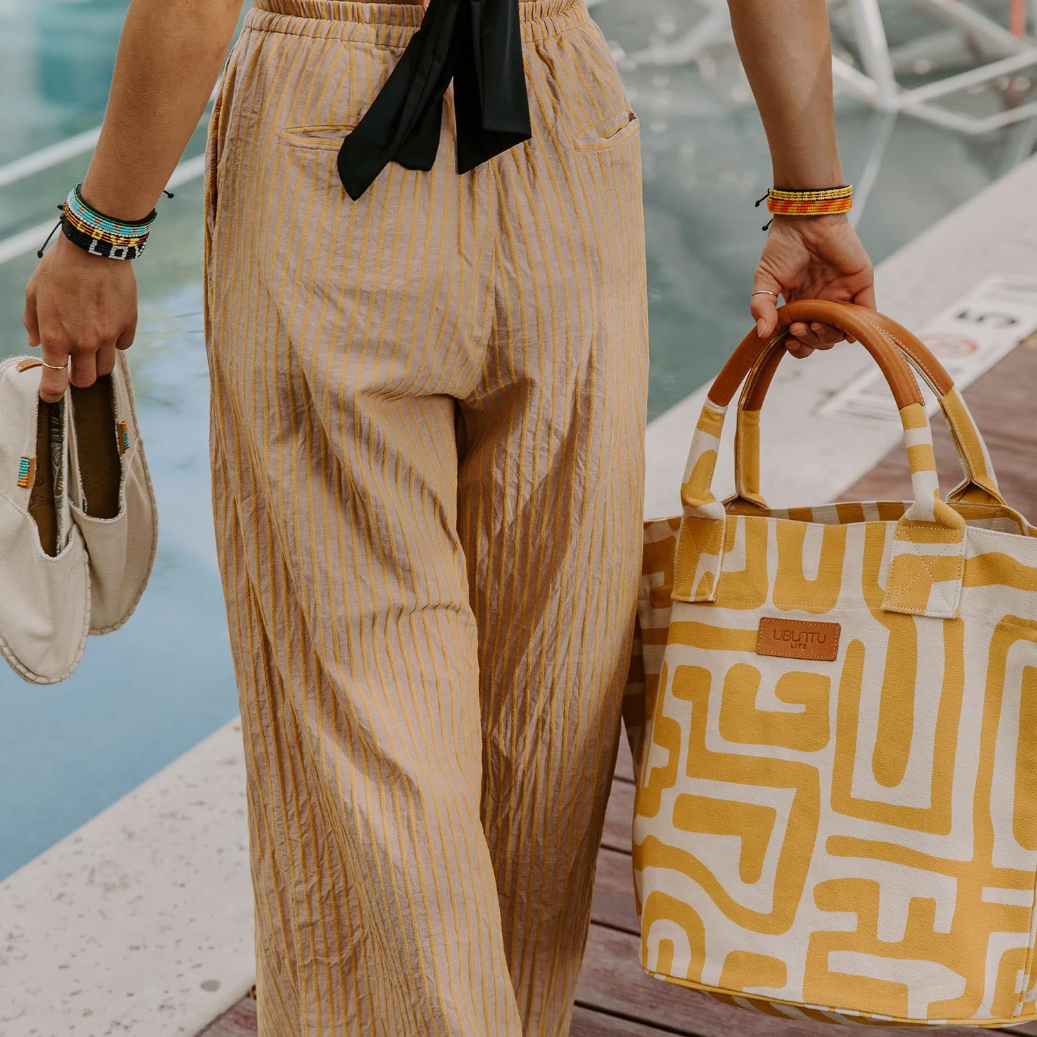 Going out of town for the weekend? Our new Weekender is just what you need for a fun-filled trip! Roomy & easy for weekend trips or for those who need a bit more room during the workweek. This bag is the quintessential multi-purpose bag. Throw your towel, SPF, portable speaker & hit the road. We love its functionality and bright & playful design. LARGE TOTE FOR VERSATILE USE: The Weekender tote bag for women is perfect for use as a getaway travel tote bag, summer beach bag, teacher tote bag, or for whenever you need a spacious and reliable large tote purse. It’s great for casual, everyday use with a fun and bright boho African print. BEAUTIFUL & WELL-MADE CANVAS BAG: This tote travel bag is made with 100% natural cotton and has hand silk-screen printed Kuba Cloth patterns in water-based inks. The large beach tote bag is also sturdy, with reinforced leather handles and piping seams. SPACIOUS, CONVENIENT DESIGN: Our large travel tote bags feature a magnetic button closure for easy access, an internal zipper pocket for safely securing smaller items, and a spacious main compartment for holding clothes, essentials, books, beach towels, and more. Each large canvas tote bag can hold up to 40lbs of goods. A PRODUCT OF WOMEN EMPOWERMENT: All of our canvas bags are made by women and moms in our community in Kenya, Africa. Every purchase of a canvas tote helps empower and create independence through sustainable employment. ABOUT : “Ubuntu” is an African philosophy that means “I am, because we are,” which is why we believe in finding meaningful, permanent ways to support and connect our communities. Our foundation harnesses the power of global commerce to create a social impact, from our bracelets and apparel to our Ubuntu Café. Join our Tribe today!