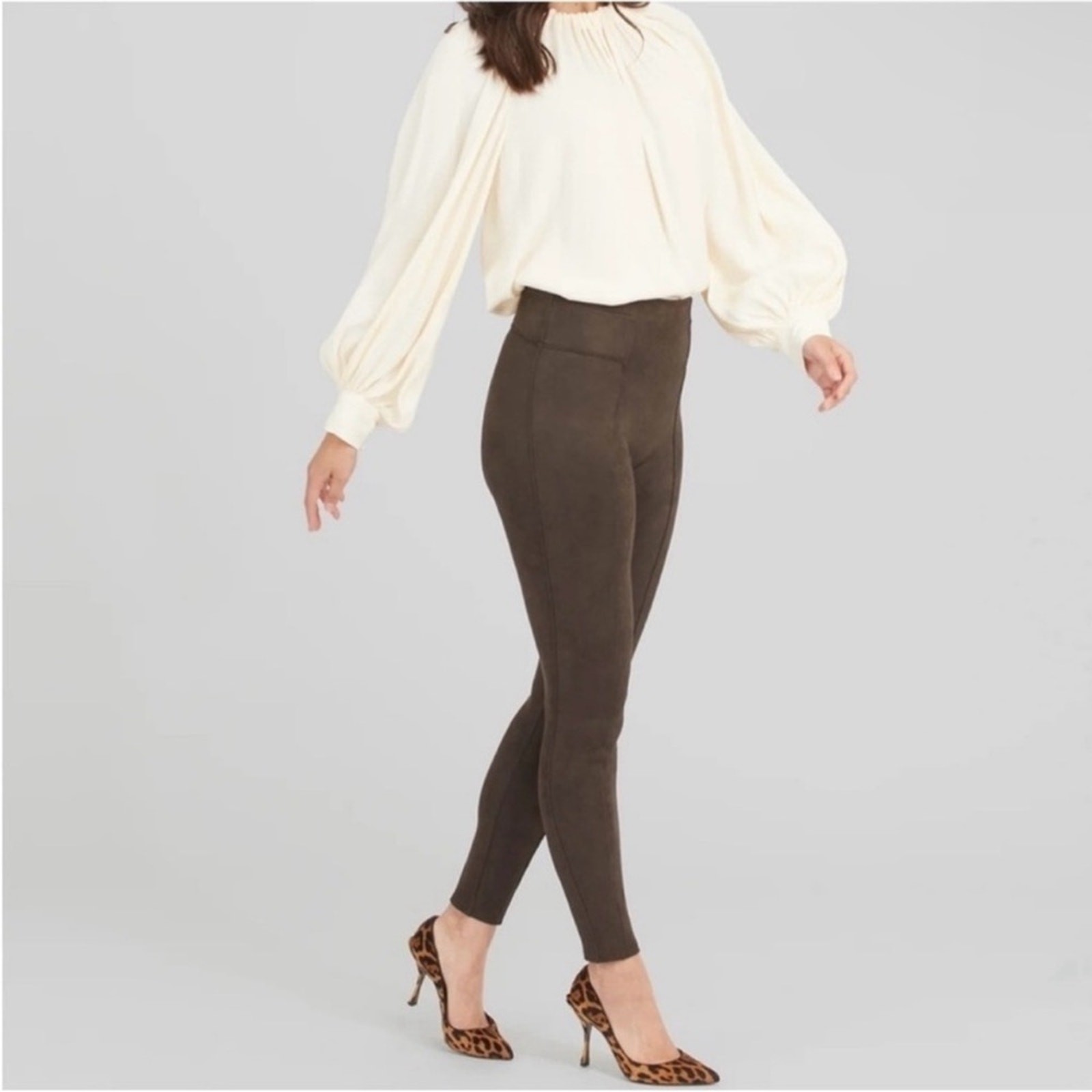 Spanx Faux Leather Legging Size XS Color: Chocolate brown Hidden core shaping technology Shimmy it on, no button or zipper for a smooth look Luxurious stretch Soft Strategically placed seams flatter your legs No rips holes or stains Approximate measurements laying flat Waist 12” Rise 11” Inseam 26