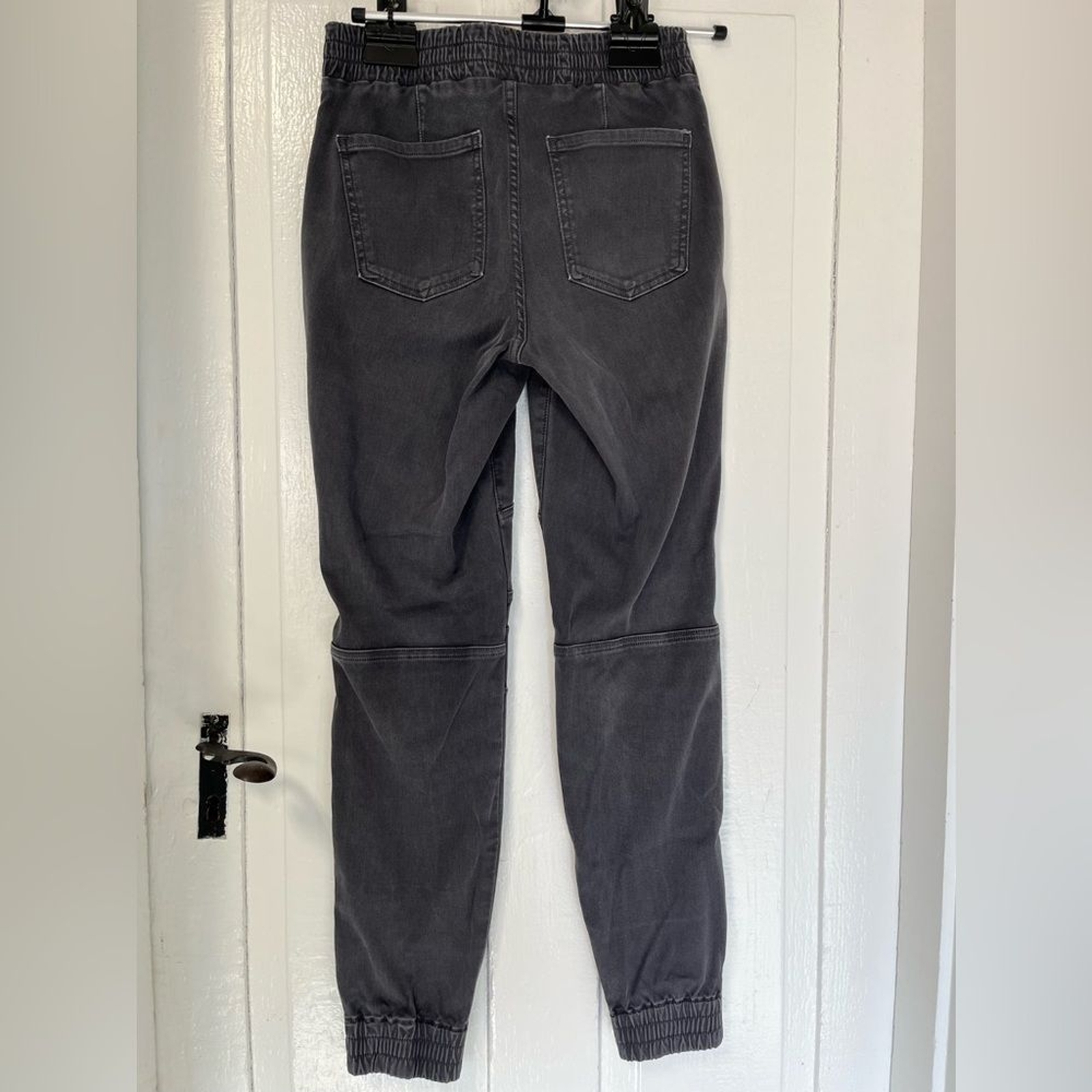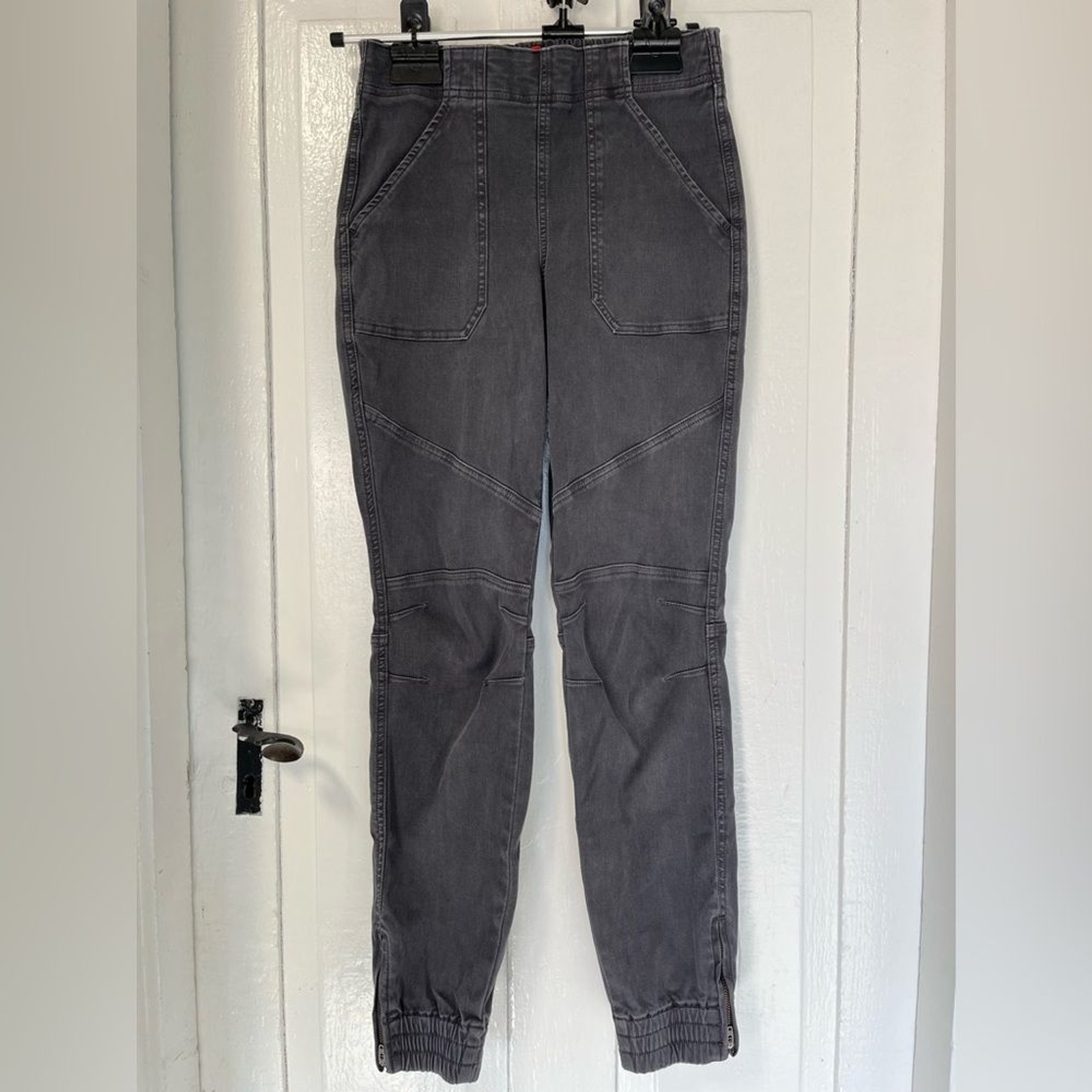 Pull on style Ankle zipper jogger Cargo style pockets Good preloved condition Washed gray color with light distressing around waistband and ankle cuffs Smoke Free Dog Friendly Home Please be aware to expect a slight variation in color due to lighting and your device screen settings . Bin B