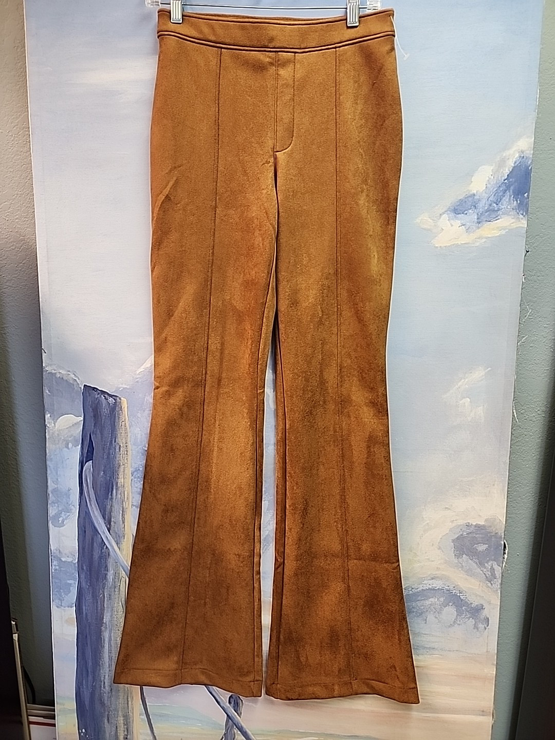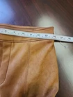 These Spanx Women's Faux Suede Flare Pants in size M feature a pull-on style with a high rise waist and a flattering flared leg design. Made of stretchy caramel brown suede material, they offer both comfort and style for various occasions like travel or casual wear. The pants have a flat front and a 33-inch inseam, suitable for the winter, summer, fall, and spring seasons. Perfect for those seeking a bohemian, city, or preppy look, these versatile pants are a chic addition to any wardrobe.