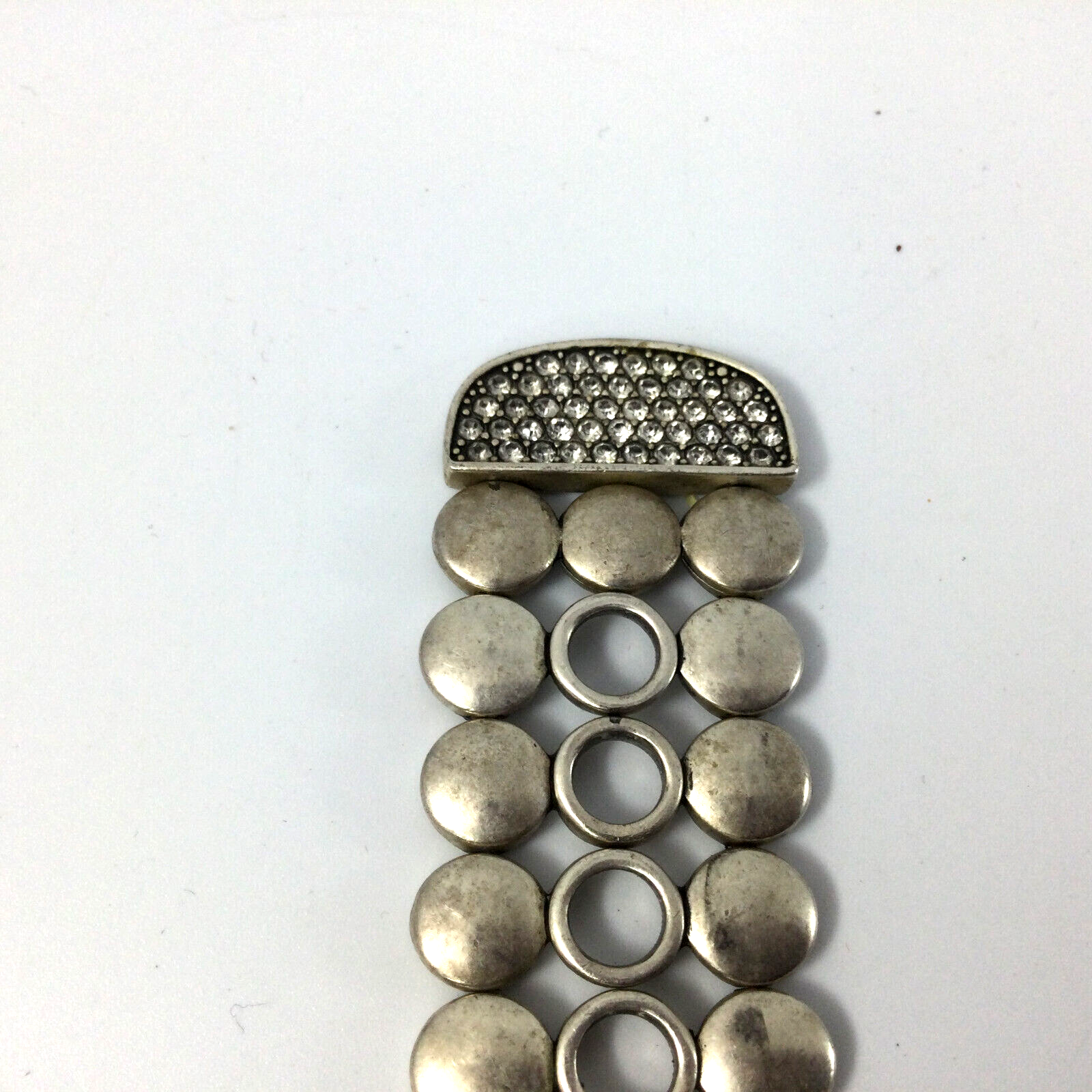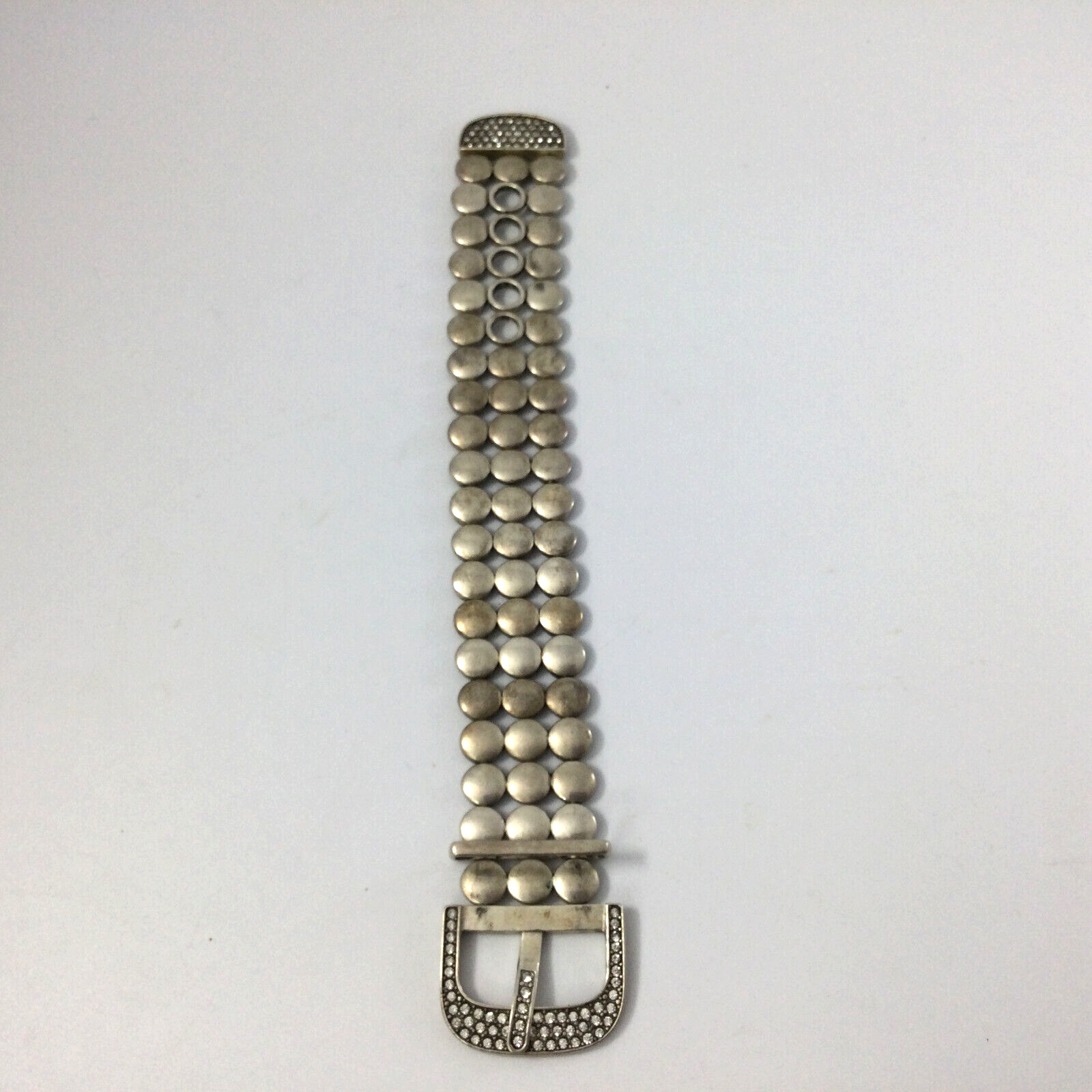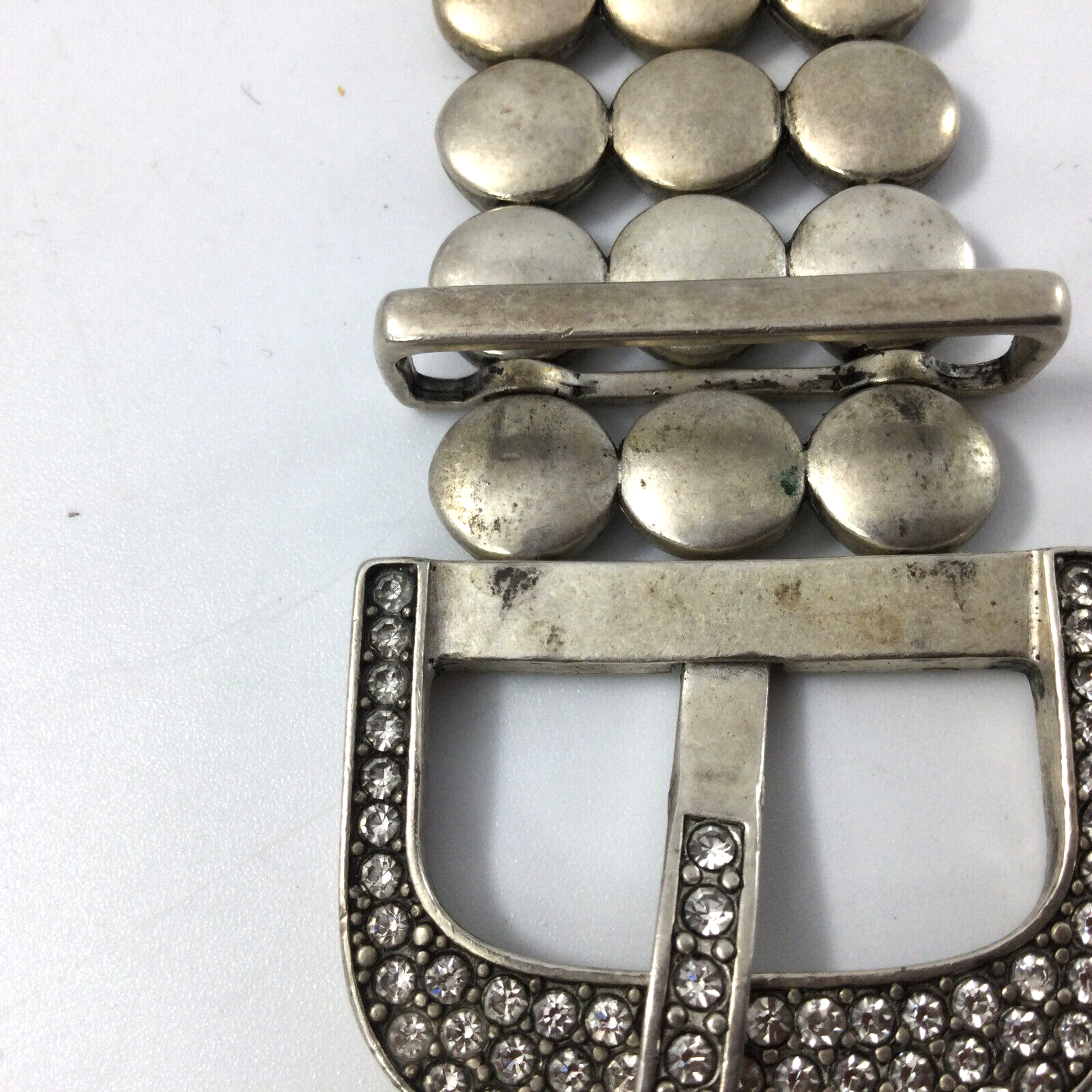 Premier Designs Silver Metal Stretchable Buckle Up Bracelet with Rhinestones. Whole bracelet is 9" long but it is 7" to the second hole. Good condition, no missing stones. There is discoloration on the metal parts, please see all photos! InvN/GW/4