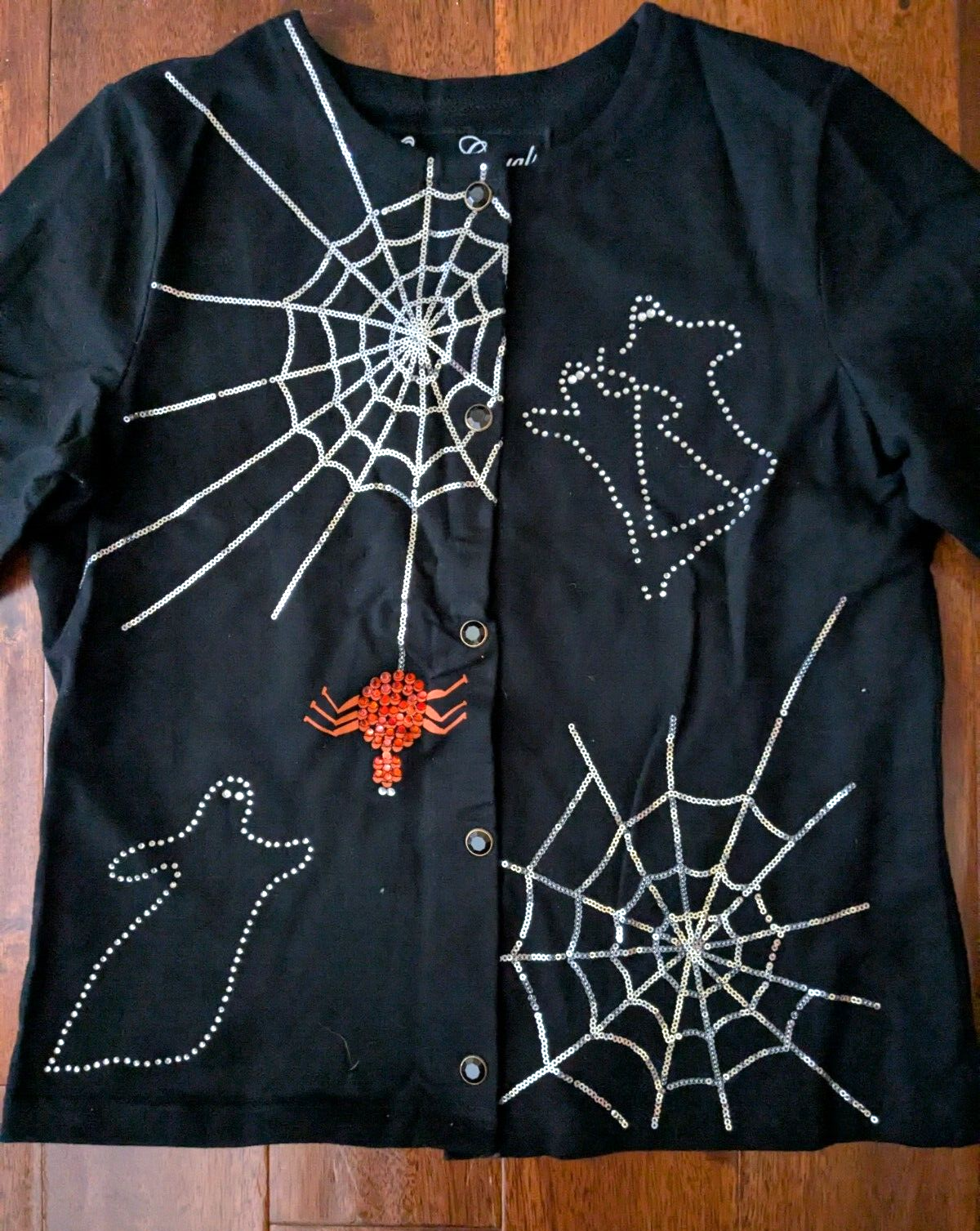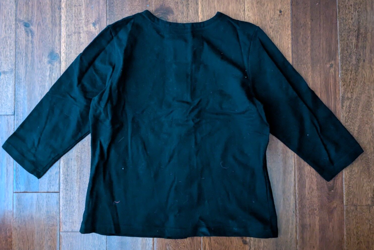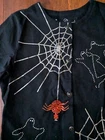 This Onque Casuals cardigan sweater in size M features a round neckline with snap closure, embellished with sequins and glitter in a Halloween spider and ghost design. Made from 100% cotton, it has a collarless, tagless style with 3/4 sleeves, ideal for the fall and winter seasons. The buttons are actually snaps with black glass like snaps This sweater is perfect for Halloween parties or casual occasions, and should be hand washed to maintain its quality. Approximate measurements laying flat: Under arm to underarm: 19" Length: 23" Please contact me with any questions. Thank you for looking.